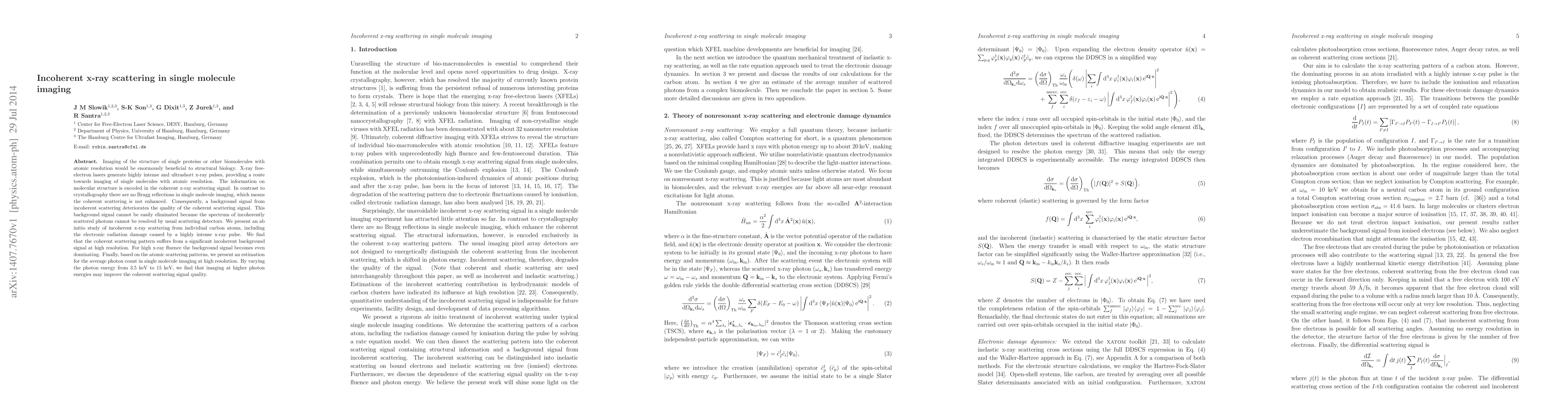 This paper explores the challenges of incoherent x-ray scattering in single molecule imaging using x-ray free-electron lasers, revealing that high-resolution imaging is significantly hindered by a dominating incoherent background signal. The study suggests that higher photon energies may enhance coherent scattering quality.