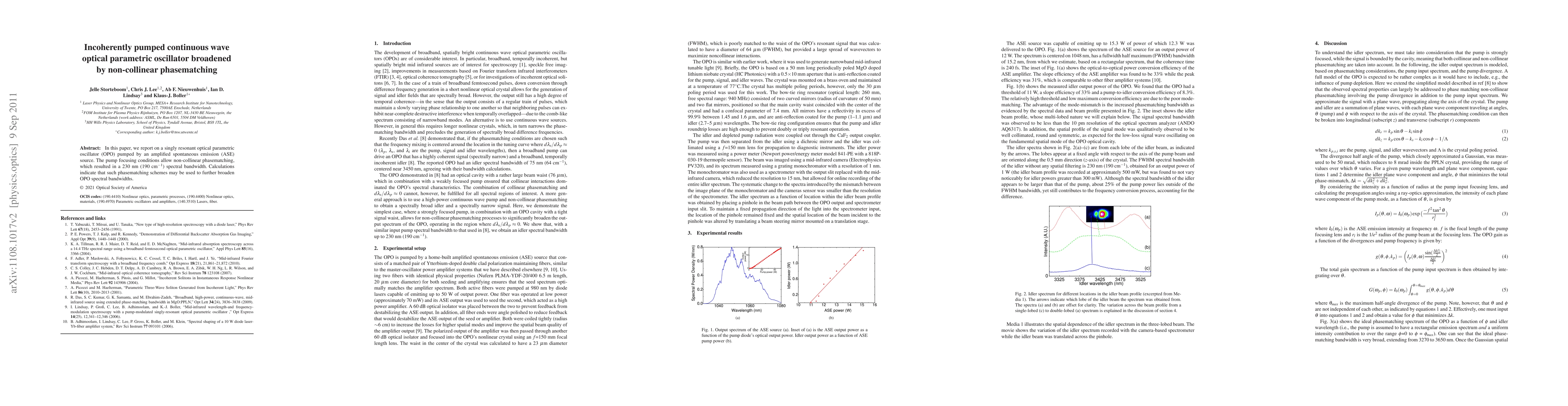 This paper describes a singly resonant optical parametric oscillator (OPO) using incoherent amplified spontaneous emission (ASE) for pumping, achieving a 230 nm spectral bandwidth through non-collinear phasematching. The study suggests that this phasematching technique can be utilized to significantly broaden OPO spectral bandwidths.