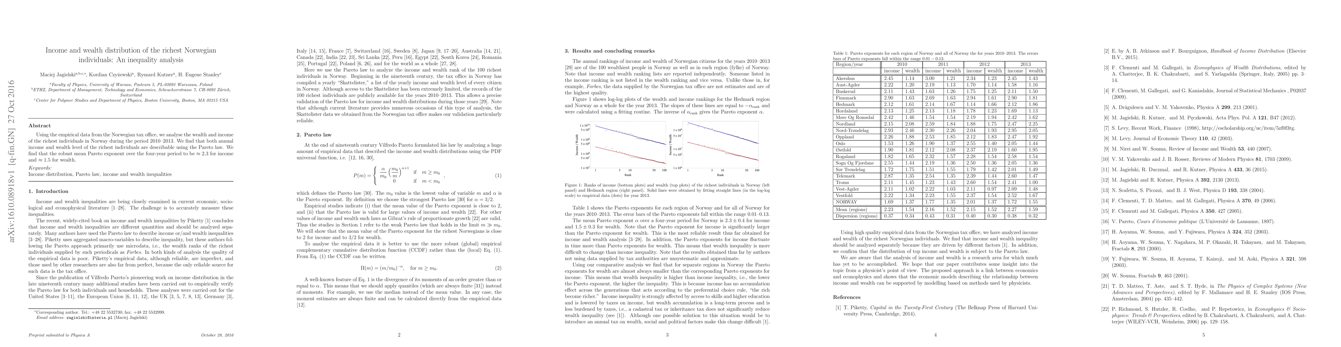 Using the empirical data from the Norwegian tax office, we analyse the wealth and income of the richest individuals in Norway during the period 2010--2013. We find that both annual income and wealth level of the richest individuals are describable using the Pareto law. We find that the robust mean Pareto exponent over the four-year period to be $\approx 2.3$ for income and $\approx 1.5$ for wealth.