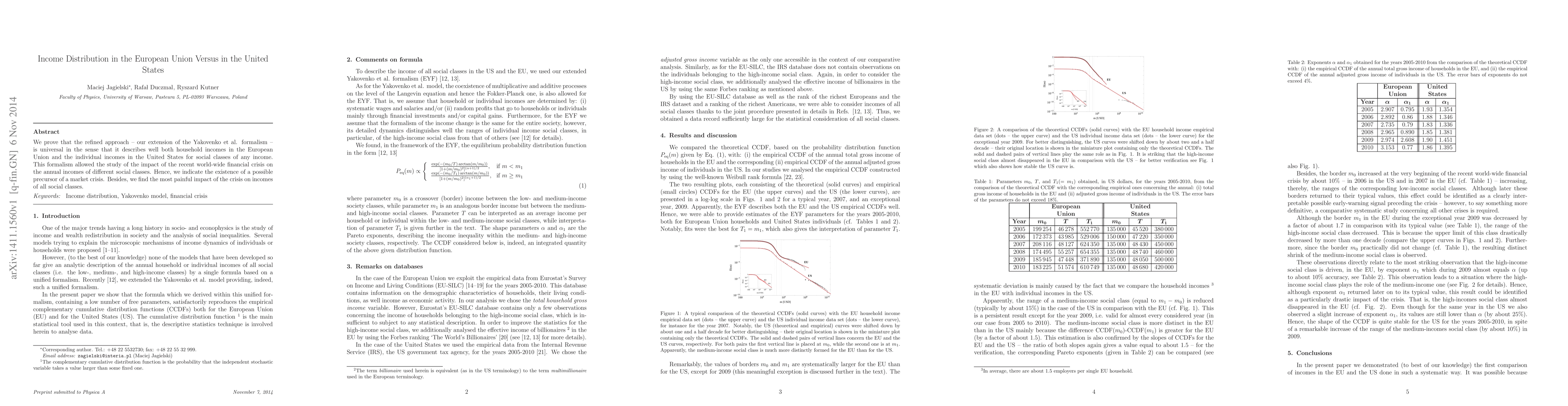 We prove that the refined approach -- our extension of the Yakovenko et al. formalism -- is universal in the sense that it describes well both household incomes in the European Union and the individual incomes in the United States for social classes of any income. This formalism allowed the study of the impact of the recent world-wide financial crisis on the annual incomes of different social classes. Hence, we indicate the existence of a possible precursor of a market crisis. Besides, we find the most painful impact of the crisis on incomes of all social classes.