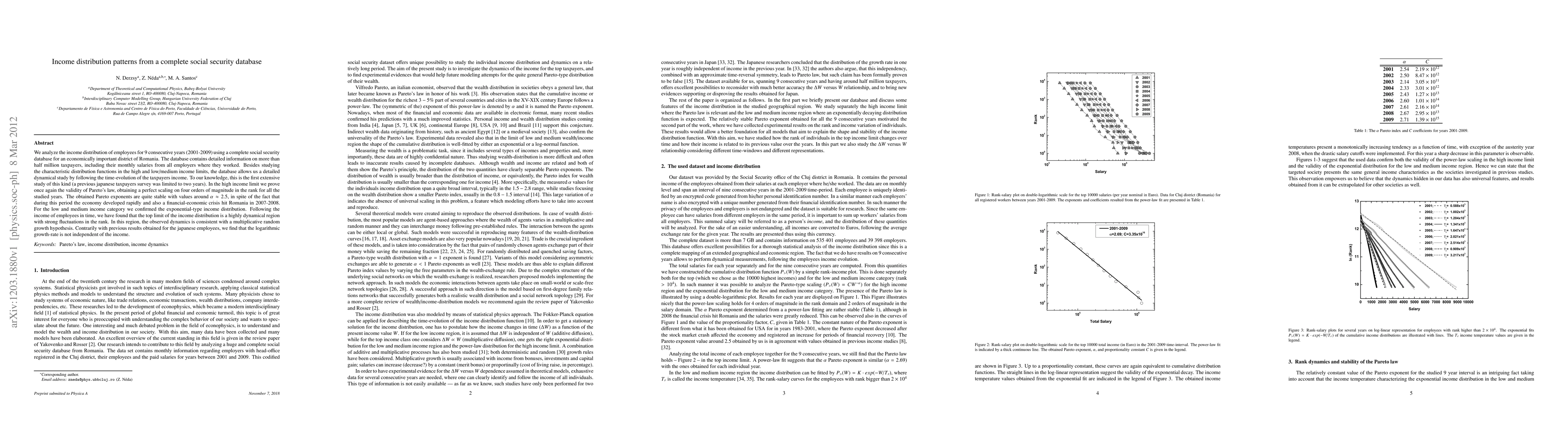 We analyze the income distribution of employees for 9 consecutive years (2001-2009) using a complete social security database for an economically important district of Romania. The database contains detailed information on more than half million taxpayers, including their monthly salaries from all employers where they worked. Besides studying the characteristic distribution functions in the high and low/medium income limits, the database allows us a detailed dynamical study by following the time-evolution of the taxpayers income. To our knowledge, this is the first extensive study of this kind (a previous japanese taxpayers survey was limited to two years). In the high income limit we prove once again the validity of Pareto's law, obtaining a perfect scaling on four orders of magnitude in the rank for all the studied years. The obtained Pareto exponents are quite stable with values around $\alpha \approx 2.5$, in spite of the fact that during this period the economy developed rapidly and also a financial-economic crisis hit Romania in 2007-2008. For the low and medium income category we confirmed the exponential-type income distribution. Following the income of employees in time, we have found that the top limit of the income distribution is a highly dynamical region with strong fluctuations in the rank. In this region, the observed dynamics is consistent with a multiplicative random growth hypothesis. Contrarily with previous results obtained for the japanese employees, we find that the logarithmic growth-rate is not independent of the income.