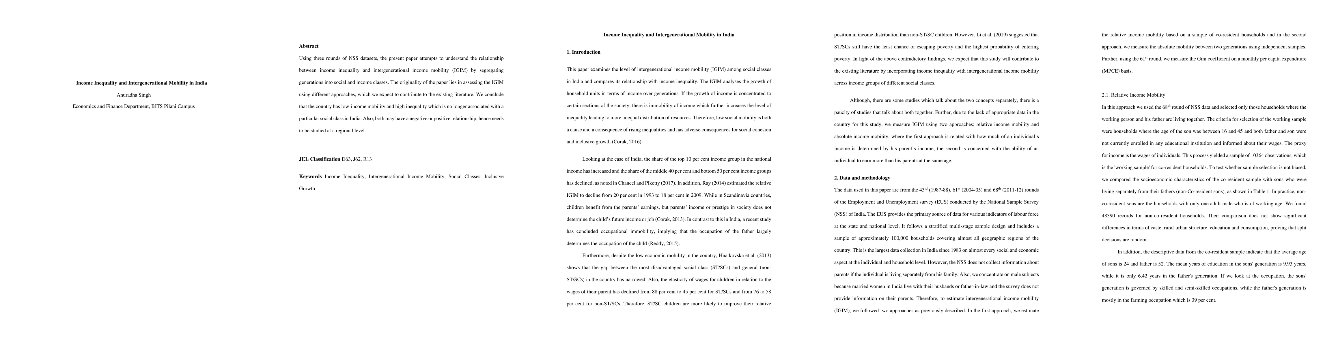 This paper examines the relationship between income inequality and intergenerational mobility in India using NSS data, finding low income mobility and high inequality that vary by region and may have either negative or positive associations. The study's originality lies in its diverse methodological approaches to assessing intergenerational income mobility.