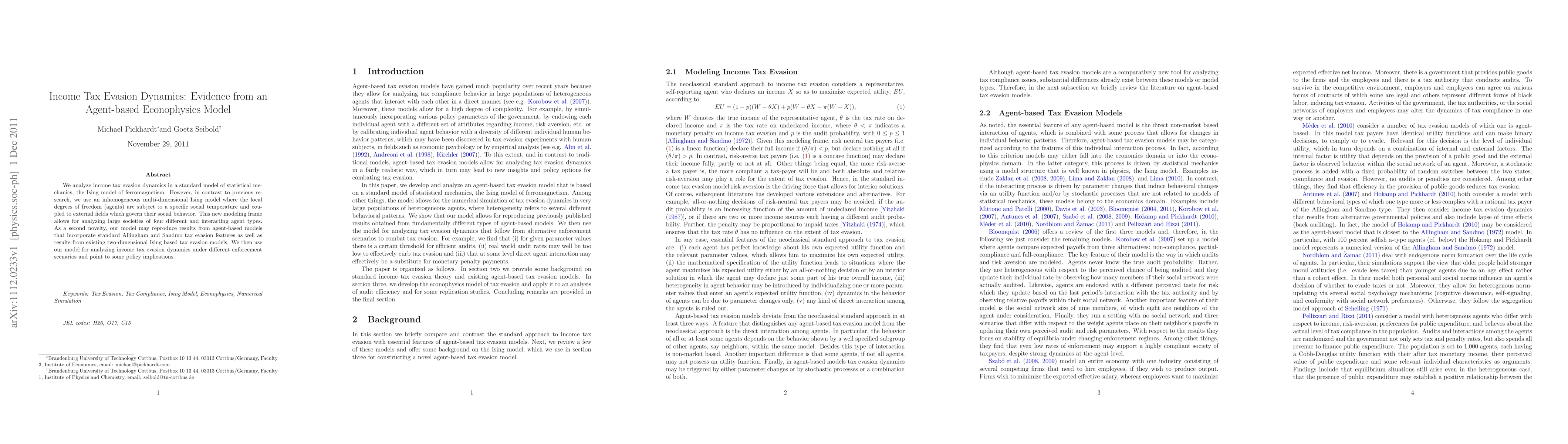 This paper employs an inhomogeneous multi-dimensional Ising model to analyze income tax evasion dynamics, incorporating social temperature and external fields to simulate agent behavior. The model successfully replicates results from both agent-based and traditional Ising-based tax evasion models, and it is used to explore tax evasion dynamics under various enforcement scenarios, highlighting potential policy implications.