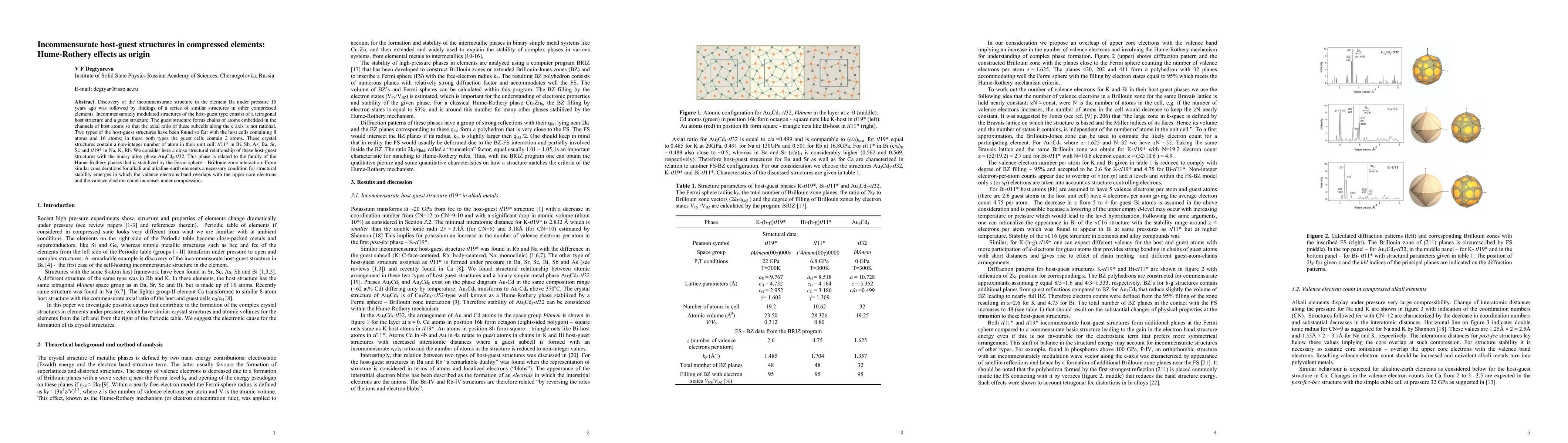 Discovery of the incommensurate structure in the element Ba under pressure 15 years ago was followed by findings of a series of similar structures in other compressed elements. Incommensurately modulated structures of the host-guest type consist of a tetragonal host structure and a guest structure. The guest structure forms chains of atoms embedded in the channels of host atoms so that the axial ratio of these subcells along the c axis is not rational. Two types of the host-guest structures have been found so far: with the host cells containing 8 atoms and 16 atoms; in these both types the guest cells contain 2 atoms. These crystal structures contain a non-integer number of atom in their unit cell: tI11* in Bi, Sb, As, Ba, Sr, Sc and tI19* in Na, K, Rb. We consider here a close structural relationship of these host-guest structures with the binary alloy phase Au3Cd5-tI32. This phase is related to the family of the Hume-Rothery phases that is stabilized by the Fermi sphere - Brillouin zone interaction. From similar considerations for alkali and alkaline-earth elements a necessary condition for structural stability emerges in which the valence electrons band overlaps with the upper core electrons and the valence electron count increases under compression.