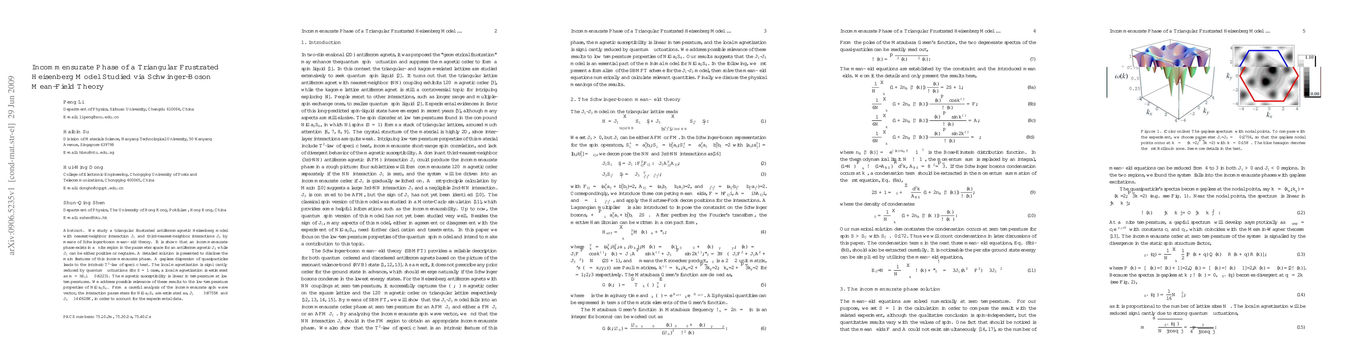 Researchers studied a triangular frustrated antiferromagnetic Heisenberg model using Schwinger-boson mean-field theory to find an incommensurate phase that exists in a specific region of the parameter space, leading to unique thermal properties.