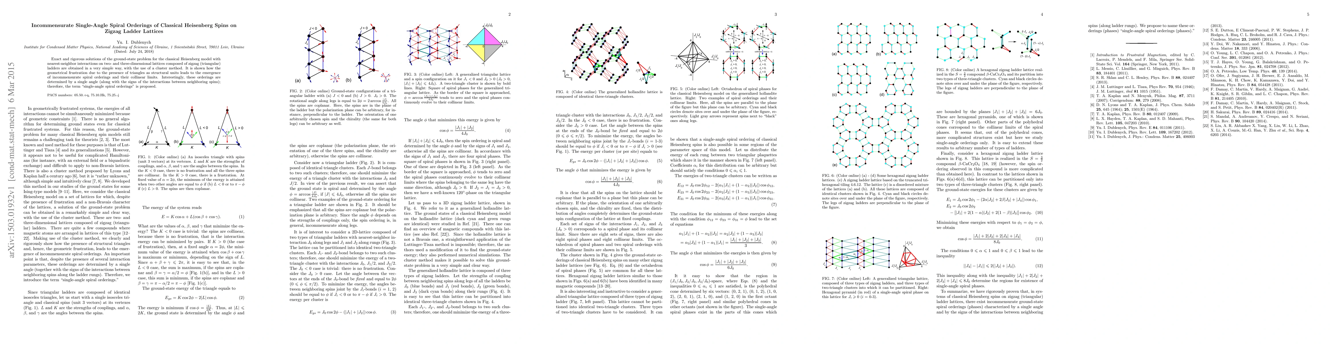 Exact and rigorous solutions of the ground-state problem for the classical Heisenberg model with nearest-neighbor interactions on two- and three-dimensional lattices composed of zigzag (triangular) ladders are obtained in a very simple way, with the use of a cluster method. It is shown how the geometrical frustration due to the presence of triangles as structural units leads to the emergence of incommensurate spiral orderings and their collinear limits. Interestingly, these orderings are determined by a single angle (along with the signs of the interactions between neighboring spins); therefore, the term "single-angle spiral orderings" is proposed.