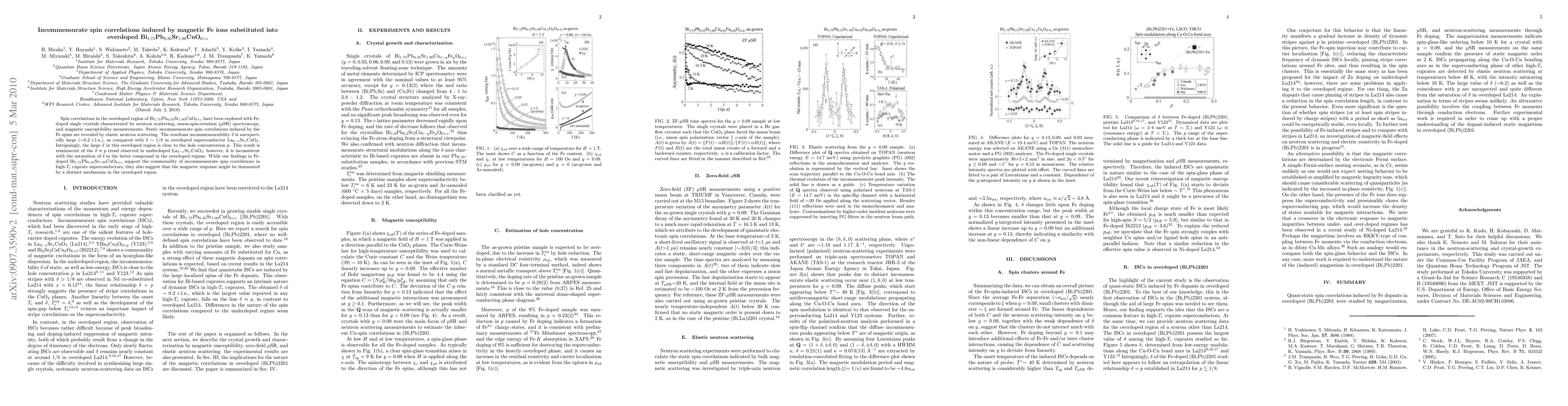 This study investigates spin correlations in overdoped Bi1.75Pb0.35Sr1.90CuO6+z doped with Fe ions, revealing static incommensurate spin correlations via neutron scattering, muSR, and magnetic susceptibility. The observed incommensurability is notably large, suggesting a distinct magnetic response mechanism in the overdoped region compared to underdoped counterparts.