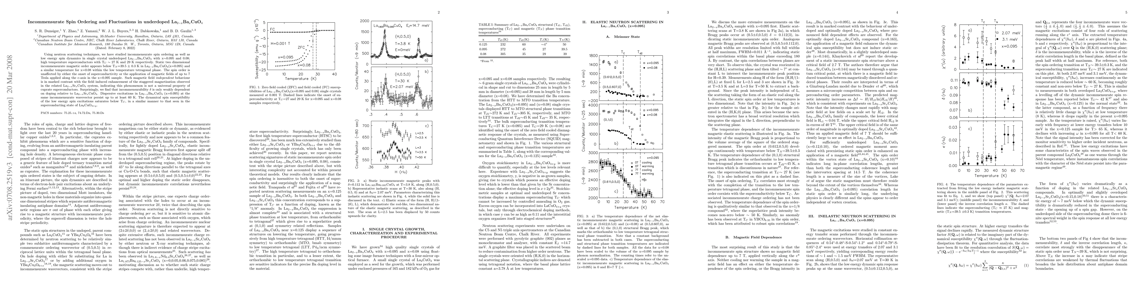 Using neutron scattering techniques, we have studied incommensurate spin ordering as well as low energy spin dynamics in single crystal underdoped \LBCO with x$\sim$0.095 and 0.08; high temperature superconductors with T$_C \sim$ 27 K and 29 K respectively. Static two dimensional incommensurate magnetic order appears below T$_N$=39.5 $\pm$ 0.3 K in \LBCO (x=0.095) and a similar temperature for x=0.08 within the low temperature tetragonal phase. The spin order is unaffected by either the onset of superconductivity or the application of magnetic fields of up to 7 Tesla applied along the c-axis in the x=0.095 sample. Such magnetic field {\it independent} behaviour is in marked contrast with the field induced enhancement of the staggered magnetisation observed in the related \LSCO system, indicating this phenomenon is not a universal property of cuprate superconductors. Surprisingly, we find that incommensurability $\delta $ is only weakly dependent on doping relative to \LSCO. Dispersive excitations in \LBCO (x=0.095) at the same incommensurate wavevector persist up to at least 60 K. The dynamical spin susceptibility of the low energy spin excitations saturates below \tc, in a similar manner to that seen in the superconducting state of La$_2$CuO$_{4+y}$.