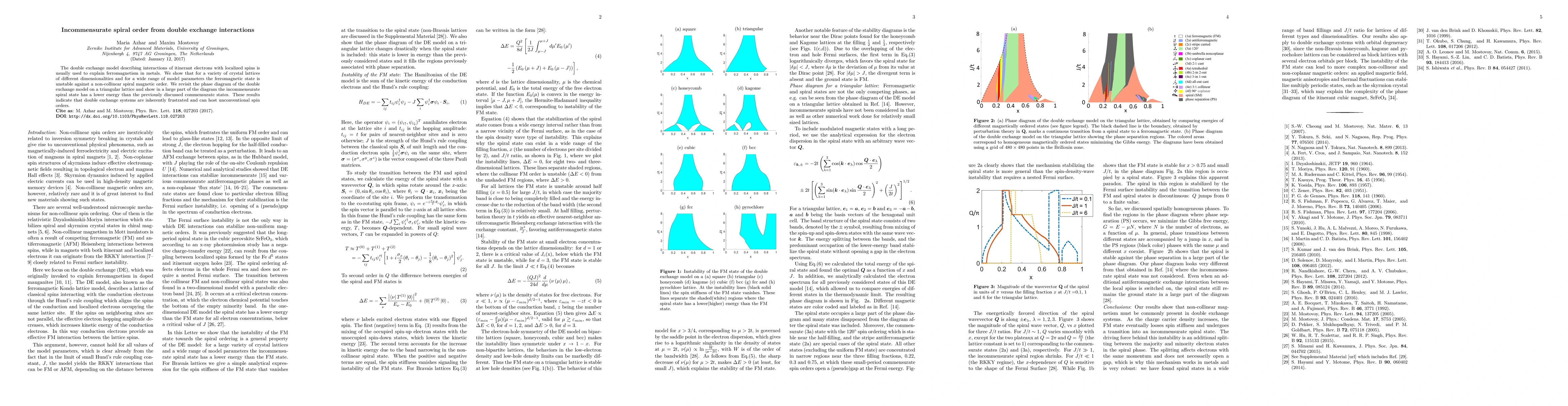 This paper demonstrates that the double exchange model, typically used to explain ferromagnetism, leads to an incommensurate spiral magnetic order in various crystal lattices, indicating inherent frustration and unconventional spin orders in these systems. The incommensurate spiral state is found to be energetically favorable over the previously considered commensurate states in a large part of the model's phase diagram.