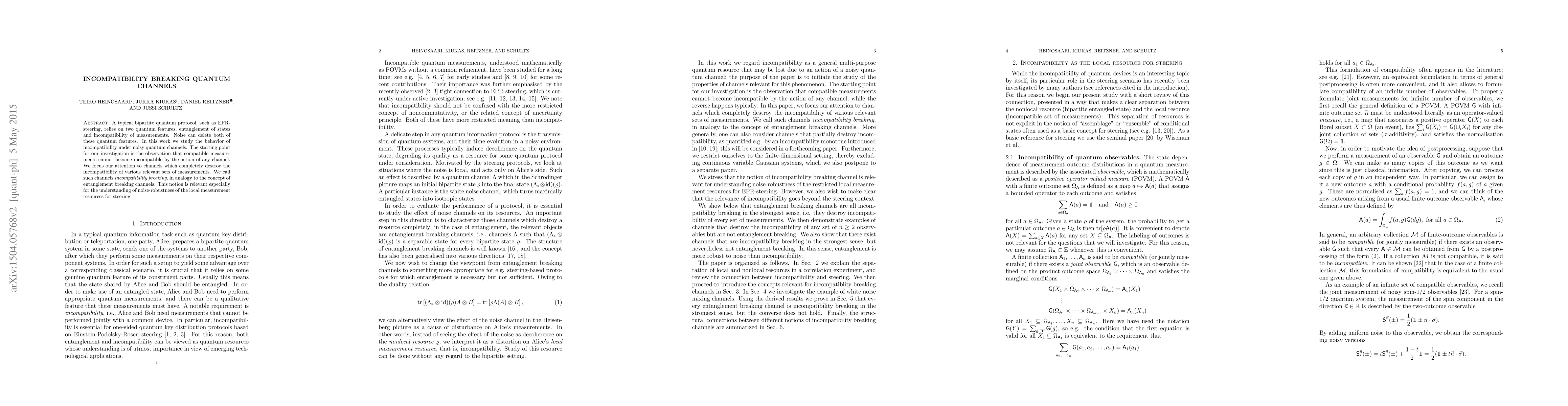 A typical bipartite quantum protocol, such as EPR-steering, relies on two quantum features, entanglement of states and incompatibility of measurements. Noise can delete both of these quantum features. In this work we study the behavior of incompatibility under noisy quantum channels. The starting point for our investigation is the observation that compatible measurements cannot become incompatible by the action of any channel. We focus our attention to channels which completely destroy the incompatibility of various relevant sets of measurements. We call such channels incompatibility breaking, in analogy to the concept of entanglement breaking channels. This notion is relevant especially for the understanding of noise-robustness of the local measurement resources for steering.
