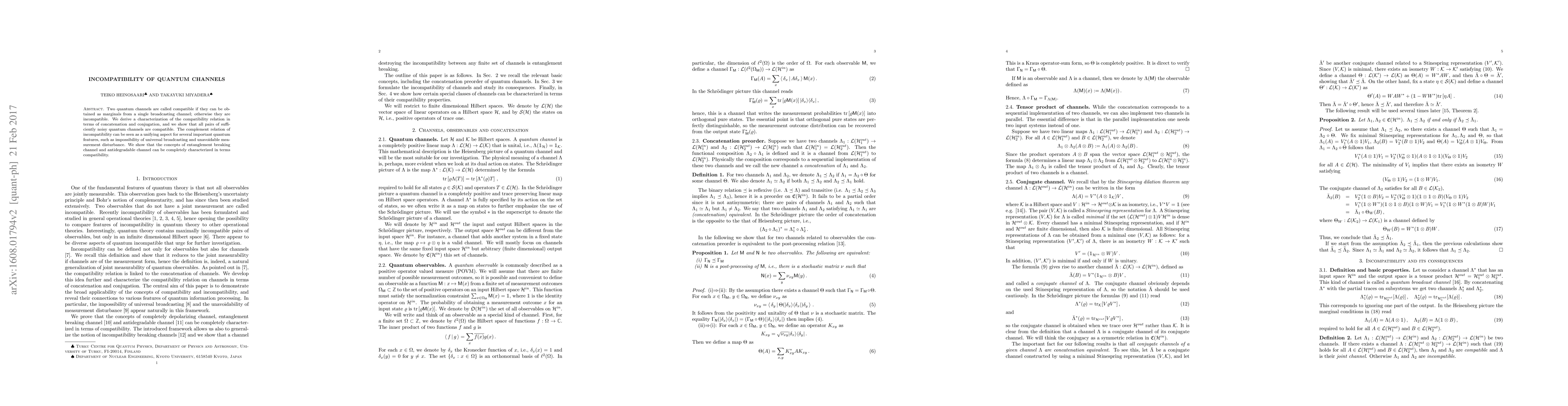 This paper characterizes the compatibility of quantum channels in terms of concatenation and conjugation, proving that all pairs of sufficiently noisy channels are compatible. It highlights the unifying role of incompatibility in quantum phenomena, including the impossibility of universal broadcasting and unavoidable measurement disturbance.