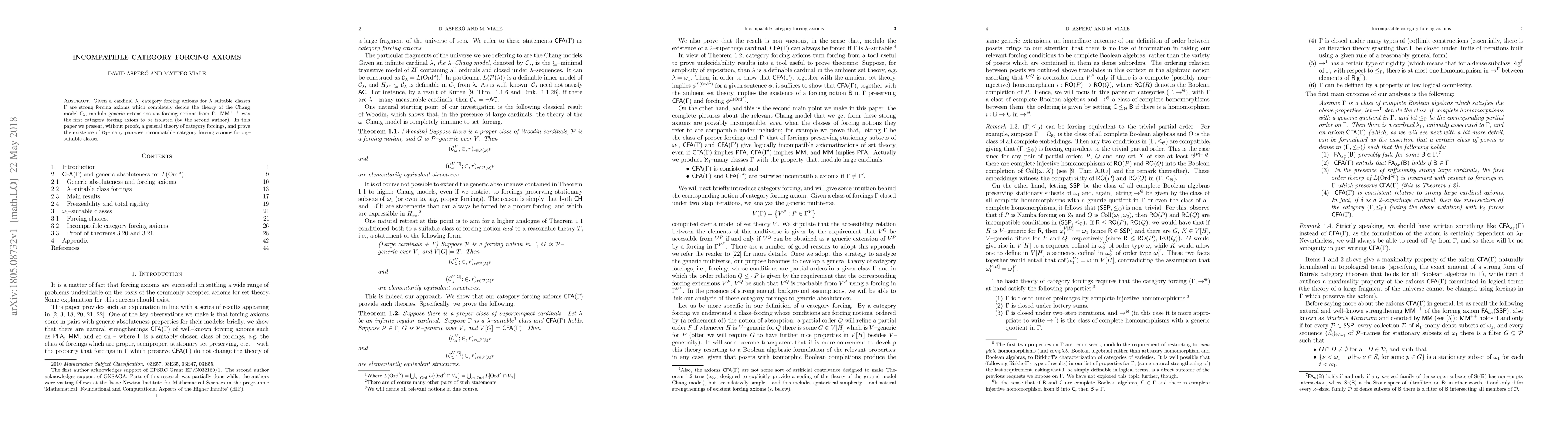 This paper develops a general theory of category forcing axioms and demonstrates the existence of $\aleph_1$-many pairwise incompatible category forcing axioms for $\omega_1$-suitable classes. These axioms significantly influence the theory of the Chang model $\mathcal C_\lambda$ via generic extensions.