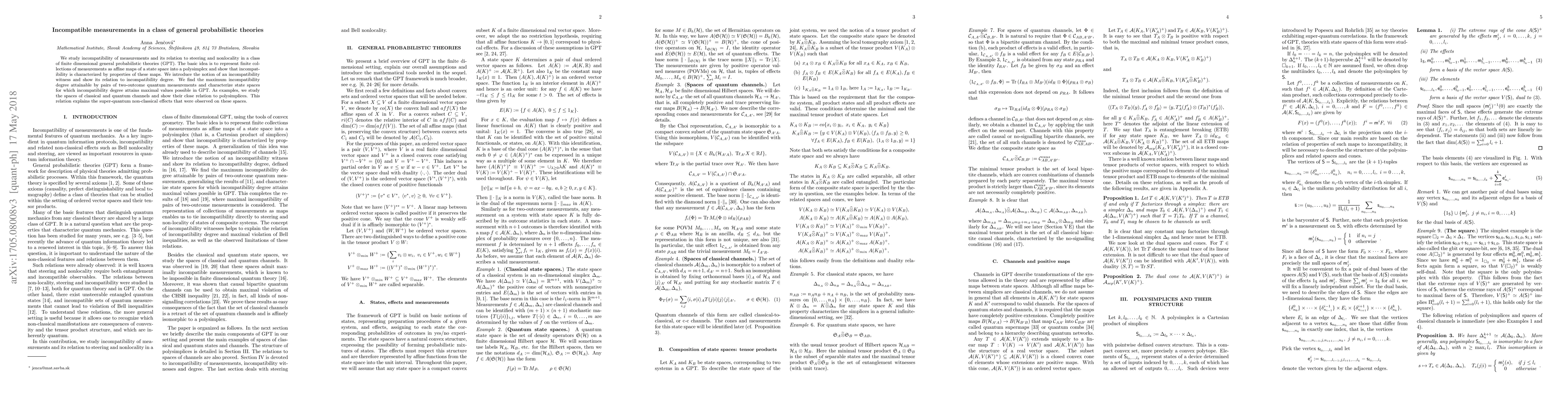 This paper investigates the incompatibility of measurements within a class of general probabilistic theories (GPT) by representing measurements as affine maps, introducing the concept of an incompatibility witness, and determining the maximum incompatibility degree achievable by pairs of quantum measurements. It also explores the relationship between classical and quantum channels and polysimplices, explaining observed super-quantum non-classical effects.