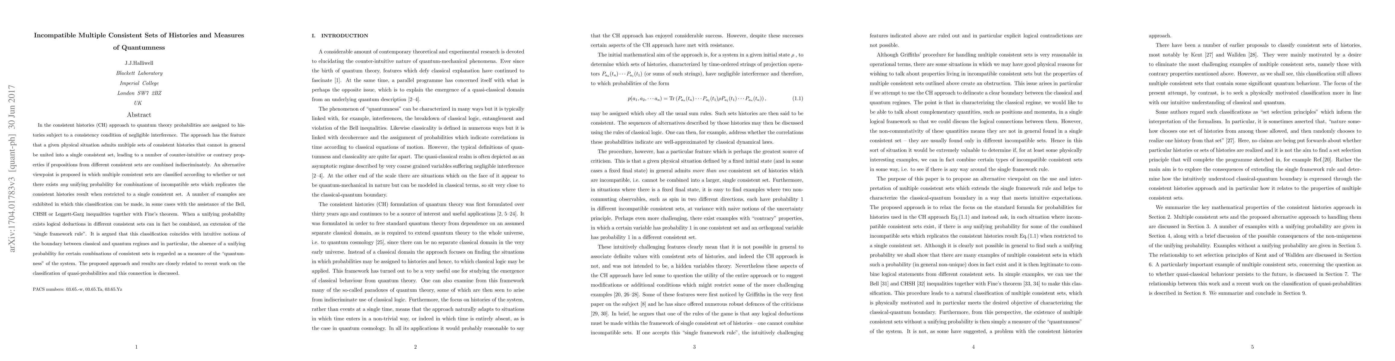 In the consistent histories (CH) approach to quantum theory probabilities are assigned to histories subject to a consistency condition of negligible interference. The approach has the feature that a given physical situation admits multiple sets of consistent histories that cannot in general be united into a single consistent set, leading to a number of counter-intuitive or contrary properties if propositions from different consistent sets are combined indiscriminately. An alternative viewpoint is proposed in which multiple consistent sets are classified according to whether or not there exists any unifying probability for combinations of incompatible sets which replicates the consistent histories result when restricted to a single consistent set. A number of examples are exhibited in which this classification can be made, in some cases with the assistance of the Bell, CHSH or Leggett-Garg inequalities together with Fine's theorem. When a unifying probability exists logical deductions in different consistent sets can in fact be combined, an extension of the "single framework rule". It is argued that this classification coincides with intuitive notions of the boundary between classical and quantum regimes and in particular, the absence of a unifying probability for certain combinations of consistent sets is regarded as a measure of the "quantumness" of the system. The proposed approach and results are closely related to recent work on the classification of quasi-probabilities and this connection is discussed.