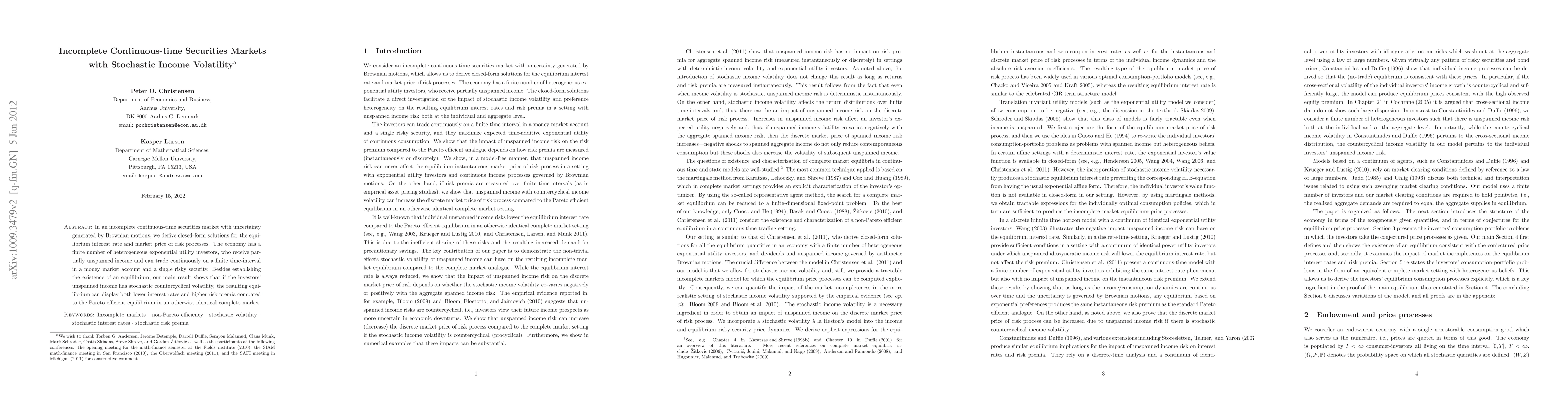 This paper derives equilibrium interest rates and market prices of risk in an incomplete continuous-time securities market with stochastic income volatility. It finds that unspanned income with stochastic countercyclical volatility can lead to lower interest rates and higher risk premia compared to a complete market.