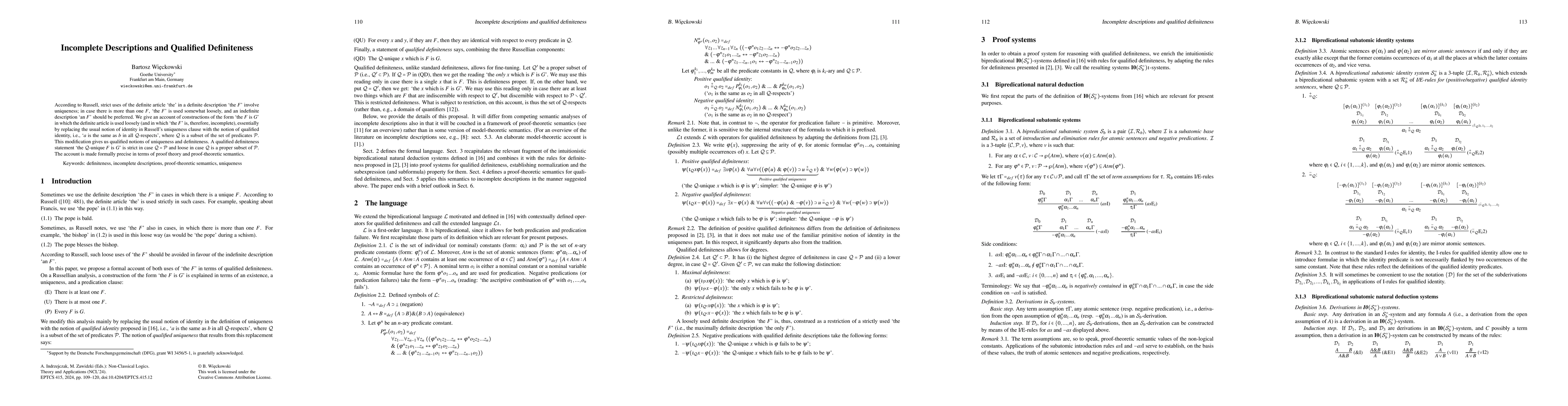 According to Russell, strict uses of the definite article 'the' in a definite description 'the F' involve uniqueness; in case there is more than one F, 'the F' is used somewhat loosely, and an indefinite description 'an F' should be preferred. We give an account of constructions of the form 'the F is G' in which the definite article is used loosely (and in which 'the F' is, therefore, incomplete), essentially by replacing the usual notion of identity in Russell's uniqueness clause with the notion of qualified identity, i.e., 'a is the same as b in all Q-respects', where Q is a subset of the set of predicates P. This modification gives us qualified notions of uniqueness and definiteness. A qualified definiteness statement 'the Q-unique F is G' is strict in case Q = P and loose in case Q is a proper subset of P. The account is made formally precise in terms of proof theory and proof-theoretic semantics.
