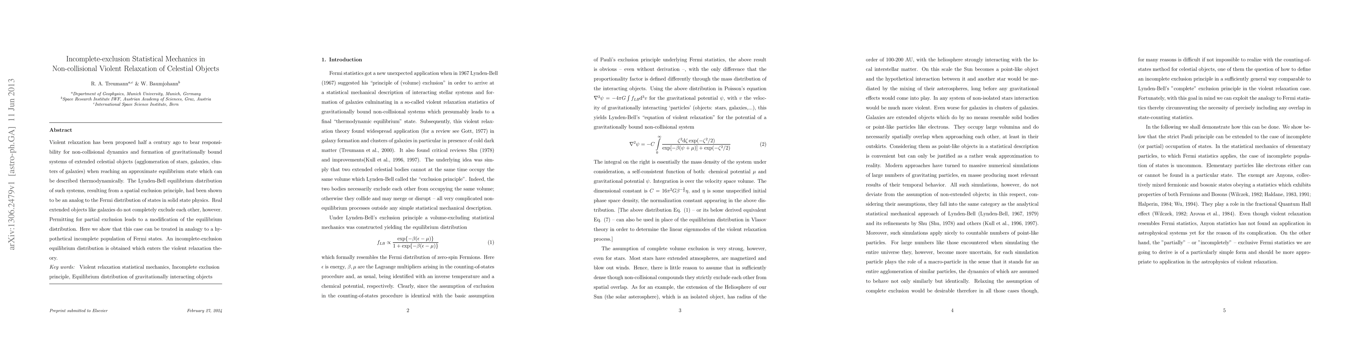 Violent relaxation has been proposed half a century ago to bear responsibility for non-collisional dynamics and formation of gravitationally bound systems of extended celestial objects (agglomeration of stars, galaxies, clusters of galaxies) when reaching an approximate equilibrium state which can be described thermodynamically. The Lynden-Bell equilibrium distribution of such systems, resulting from a spatial exclusion principle, had been shown to be an analog to the Fermi distribution of states in solid state physics. Real extended objects like galaxies do not completely exclude each other, however. Permitting for partial exclusion leads to a modification of the equilibrium distribution. Here we show that this case can be treated in analogy to a hypothetical incomplete population of Fermi states. An incomplete-exclusion equilibrium distribution is obtained which enters the violent relaxation theory.