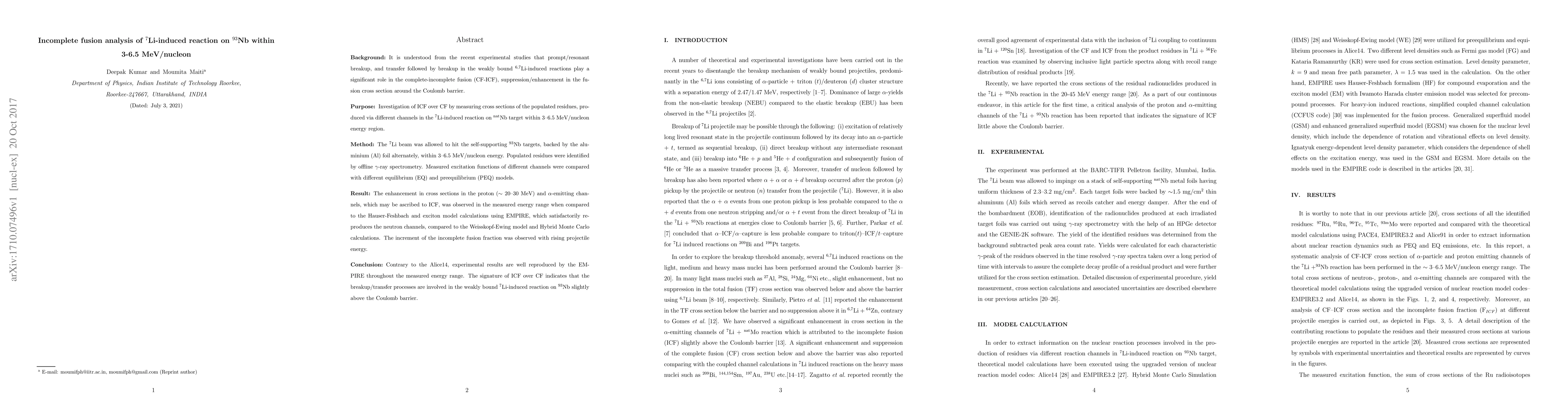 This study investigates incomplete fusion (ICF) in $^{7}$Li-induced reactions on $^{93}$Nb within 3-6.5 MeV/nucleon, observing enhanced cross sections for proton and alpha channels compared to complete fusion (CF) models. The results show an increasing incomplete fusion fraction with higher projectile energy.