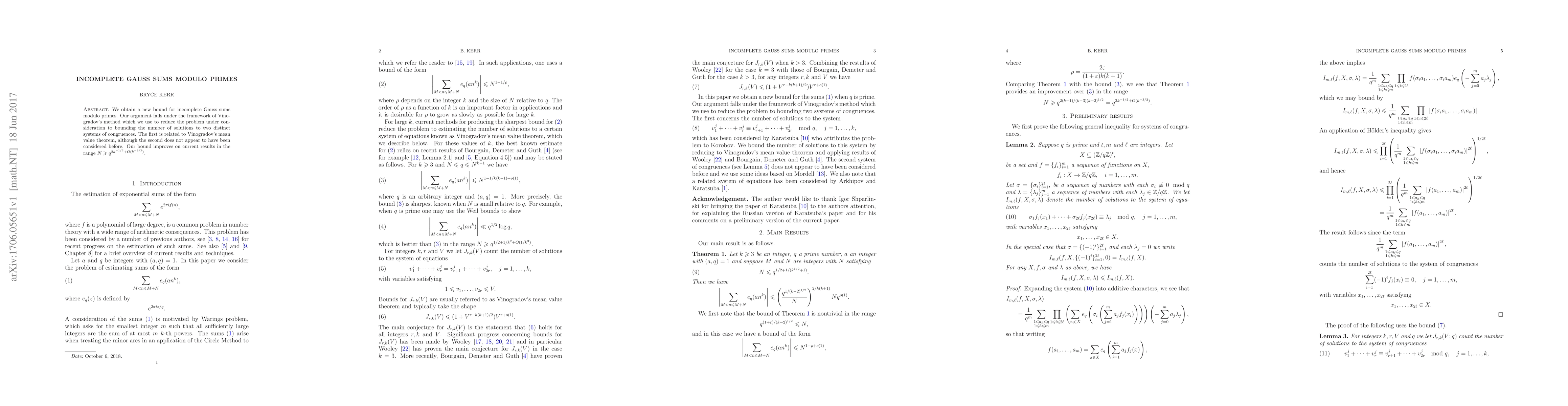 This paper presents a new bound for incomplete Gauss sums modulo primes using Vinogradov's method, improving existing results in the range $N\ge q^{2k^{-1/2}+O(k^{-3/2})}$. The approach involves bounding solutions to two distinct systems of congruences, with the second system being novel.
