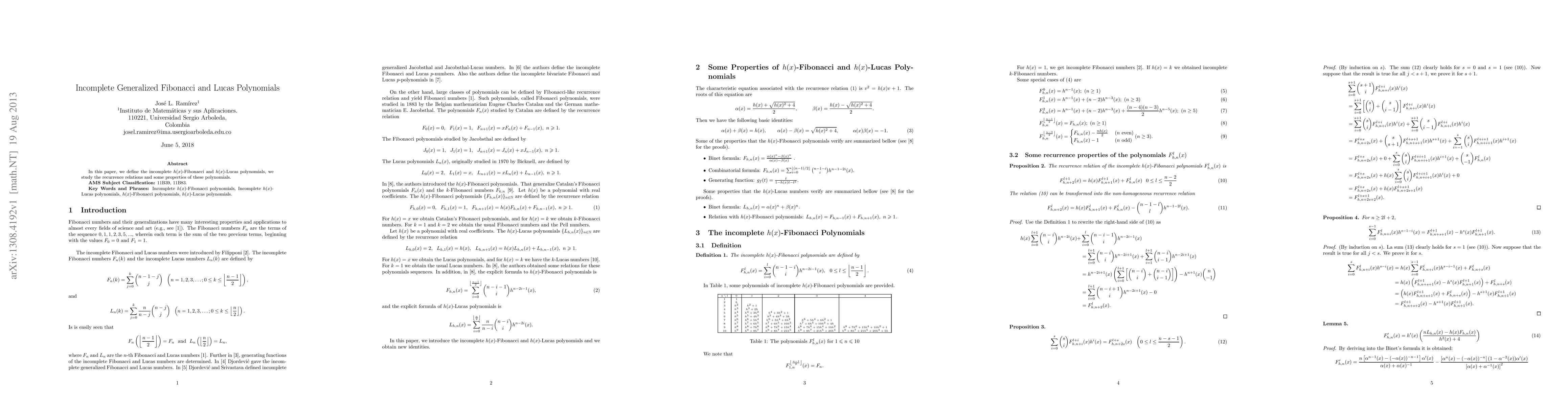 Summary: This paper introduces incomplete h(x)-Fibonacci and h(x)-Lucas polynomials, exploring their recurrence relations and fundamental properties. The study aims to extend the classical Fibonacci and Lucas sequences to a polynomial framework.