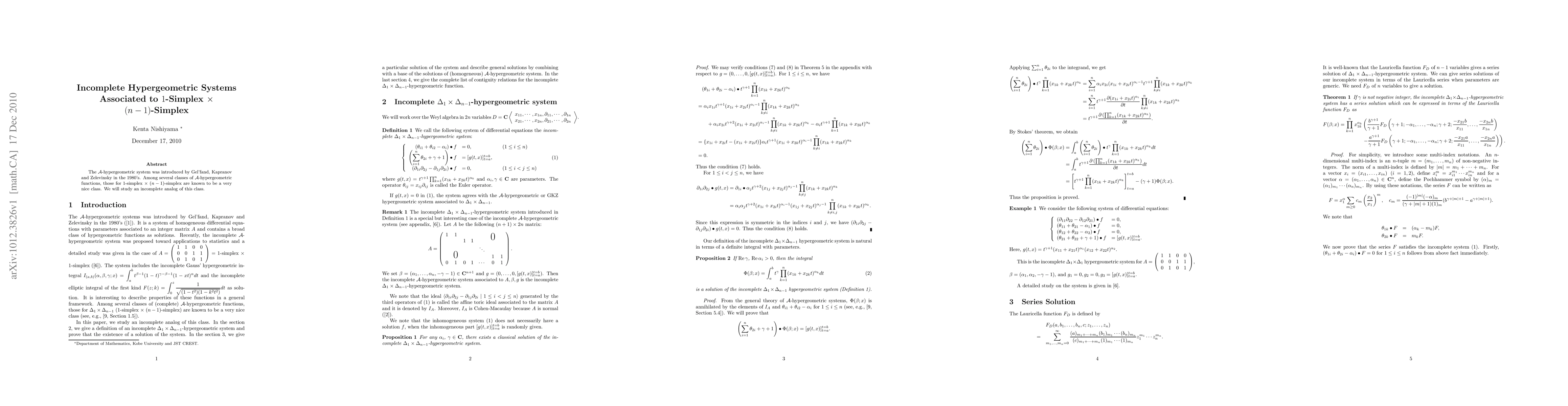 This paper investigates an incomplete version of A-hypergeometric systems associated with the geometric configuration of 1-simplex times (n-1)-simplex, originally introduced by Gel'fand, Kapranov, and Zelevinsky. The study explores properties and characteristics of these incomplete systems.