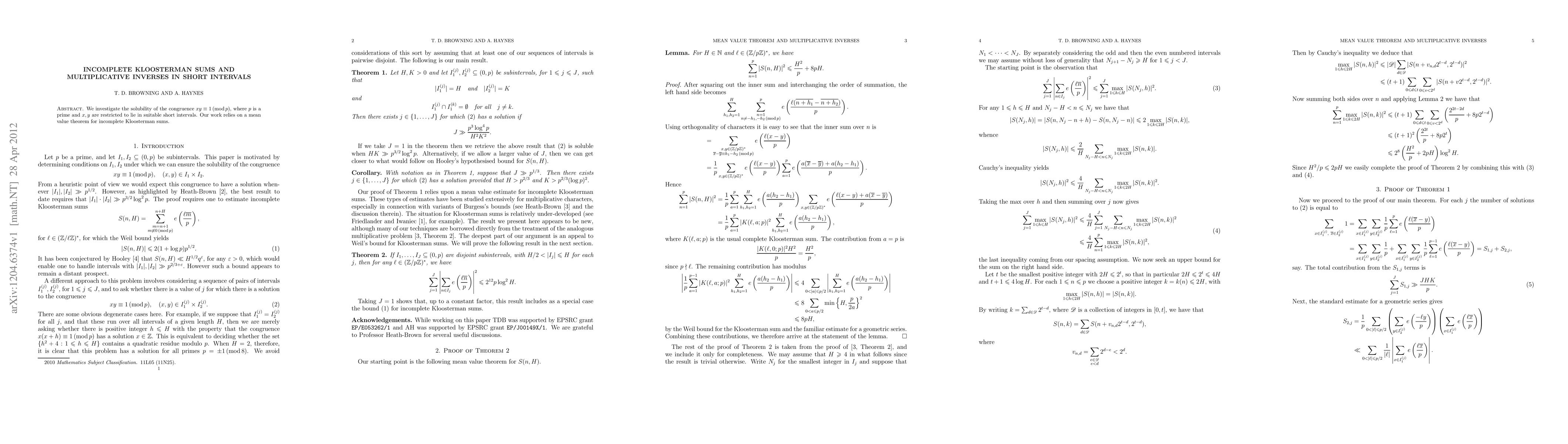 Summary: This paper explores the solvability of the congruence xy ≡ 1 (mod p) with x and y confined to specific short intervals, utilizing a mean value theorem for incomplete Kloosterman sums to achieve its results.