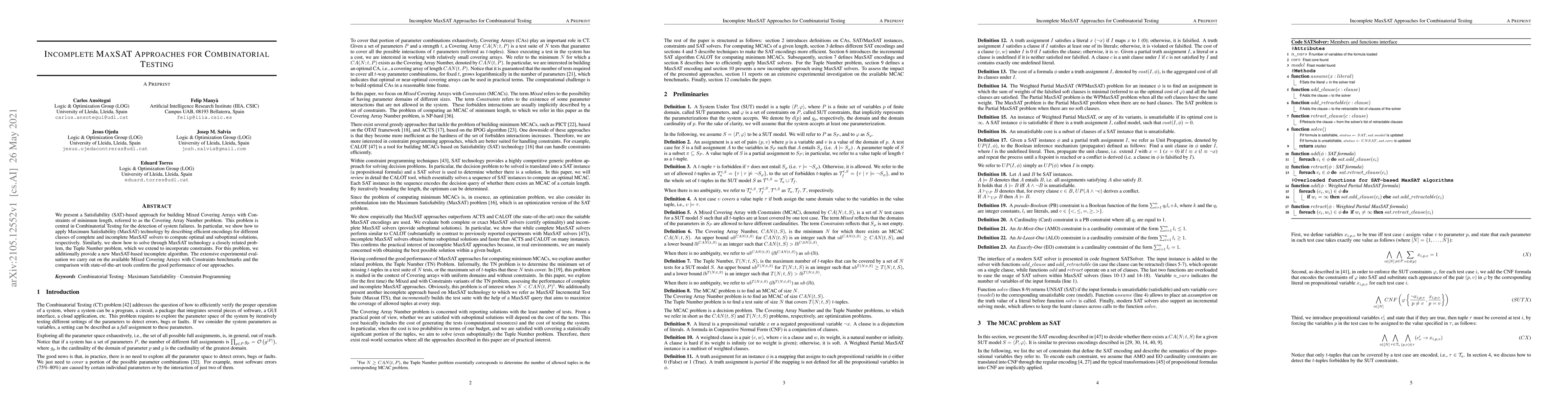 This paper proposes a SAT-based approach using MaxSAT technology to solve the Covering Array Number problem and the Tuple Number problem, both central in combinatorial testing. The authors present efficient encodings for both complete and incomplete MaxSAT solvers, and demonstrate their effectiveness through extensive experimental evaluations.