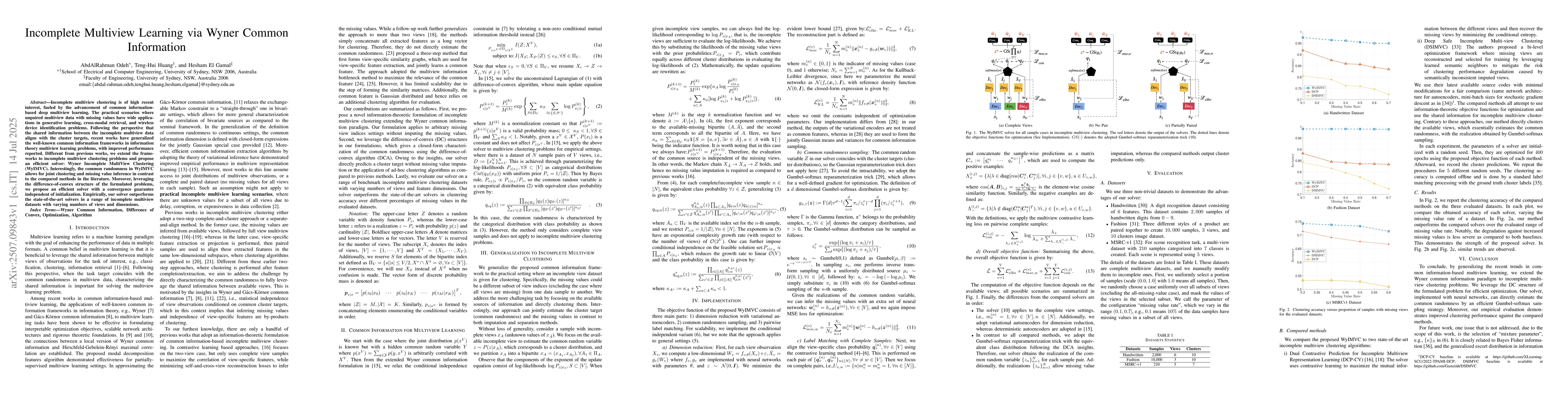 Incomplete multiview clustering is of high recent interest, fueled by the advancement of common information-based deep multiview learning. The practical scenarios where unpaired multiview data with missing values have wide applications in generative learning, cross-modal retrieval, and wireless device identification problems. Following the perspective that the shared information between the incomplete multiview data aligns with the cluster targets, recent works have generalized the well-known common information frameworks in information theory multiview learning problems, with improved performance reported. Different from previous works, we extend the frameworks to incomplete multiview clustering problems and propose an efficient solver: Wyner Incomplete MultiView Clustering (WyIMVC). Interestingly, the common randomness in WyIMVC allows for joint clustering and missing value inference in contrast to the compared methods in the literature. Moreover, leveraging the difference-of-convex structure of the formulated problems, we propose an efficient solver with a convergence guarantee independent of initialization. Empirically, our solver outperforms the state-of-the-art solvers in a range of incomplete multiview datasets with varying numbers of views and dimensions.
