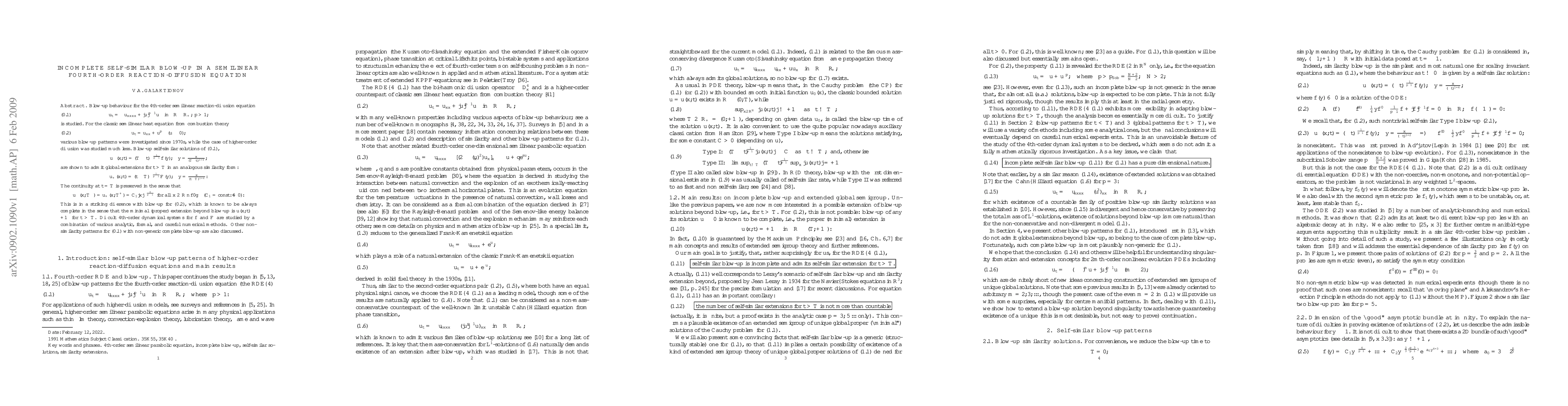 Summary: This paper demonstrates that self-similar blow-up in a fourth-order reaction-diffusion equation is incomplete, revealing a self-similar extension beyond the blow-up point. Additionally, it explores alternative complete blow-up forms that are non self-similar.