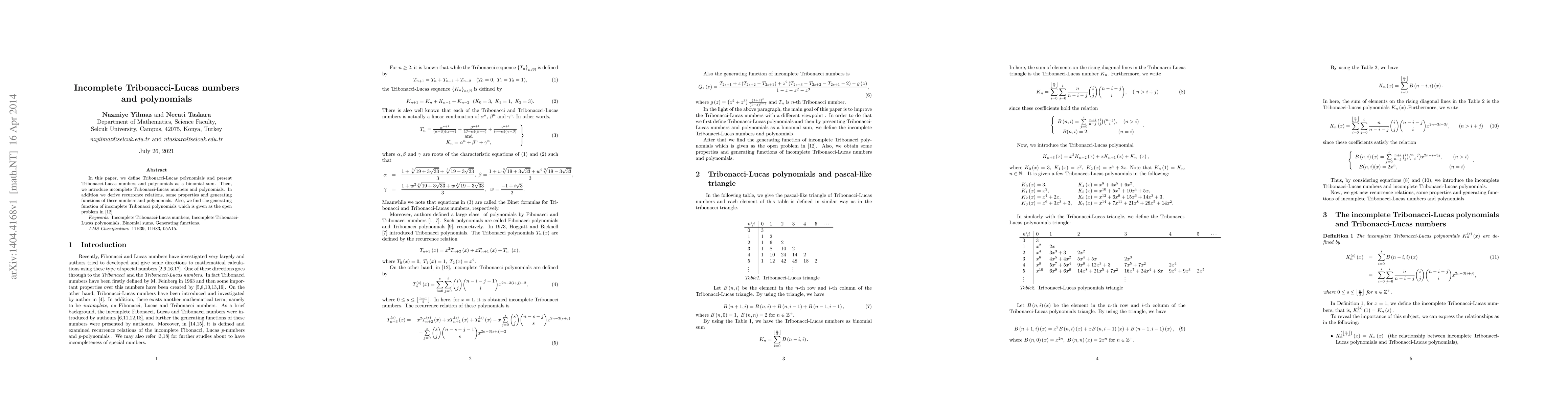 This paper defines Tribonacci-Lucas polynomials and numbers as binomial sums, introduces incomplete versions, and derives their recurrence relations, properties, and generating functions. It also solves the open problem regarding the generating function of incomplete Tribonacci polynomials.