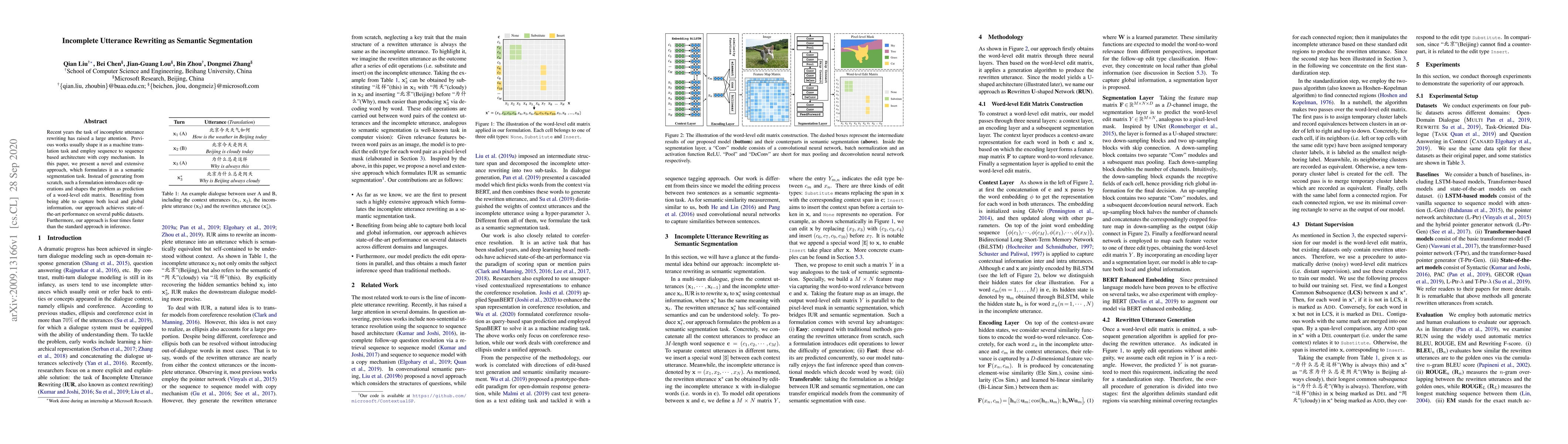 This paper proposes a novel approach to incomplete utterance rewriting by framing it as a semantic segmentation task, predicting a word-level edit matrix instead of generating text from scratch. This method captures both local and global information, achieving state-of-the-art performance and significantly faster inference times compared to traditional sequence-to-sequence models.