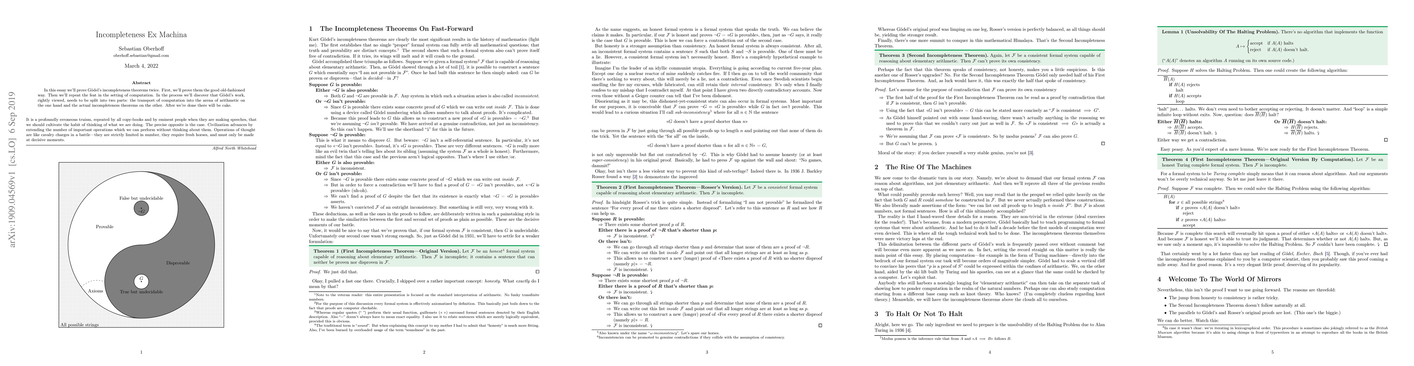 In this essay we'll prove G\"odel's incompleteness theorems twice. First, we'll prove them the good old-fashioned way. Then we'll repeat the feat in the setting of computation. In the process we'll discover that G\"odel's work, rightly viewed, needs to be split into two parts: the transport of computation into the arena of arithmetic on the one hand and the actual incompleteness theorems on the other. After we're done there will be cake.