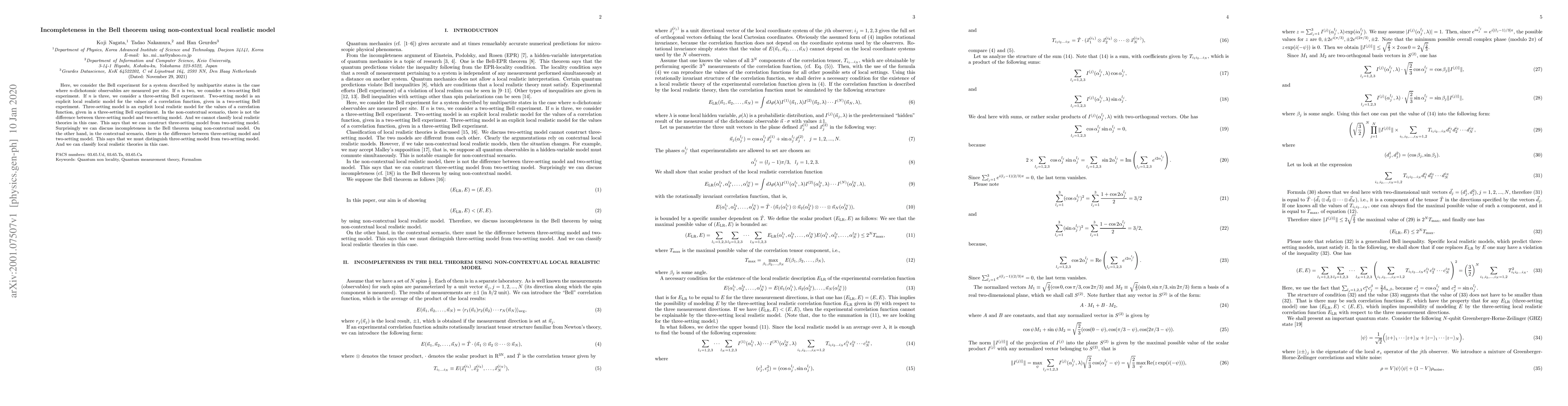 Here, we consider the Bell experiment for a system described by multipartite states in the case where n-dichotomic observables are measured per site. If n is two, we consider a two-setting Bell experiment. If n is three, we consider a three-setting Bell experiment. Twosetting model is an explicit local realistic model for the values of a correlation function, given in a two-setting Bell experiment. Three-setting model is an explicit local realistic model for the values of a correlation function, given in a three-setting Bell experiment. In the non-contextual scenario, there is not the difference between three-setting model and two-setting model. And we cannot classify local realistic theories in this case. This says that we can construct three-setting model from two-setting model. Surprisingly we can discuss incompleteness in the Bell theorem using non-contextual model. On the other hand, in the contextual scenario, there is the difference between three-setting model and two-setting model. This says that we must distinguish three-setting model from two-setting model. And we can classify local realistic theories in this case.