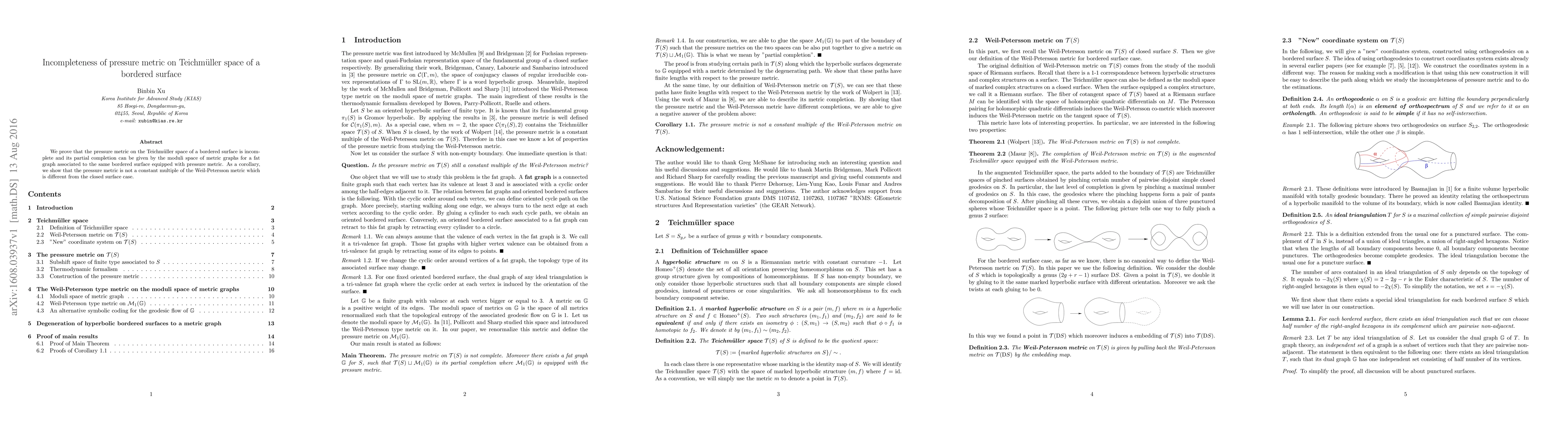 Summary: The paper demonstrates that the pressure metric on the Teichmüller space of a bordered surface is incomplete, with its partial completion achievable via the moduli space of metric graphs for a related fat graph, and shows it differs from the Weil-Petersson metric on closed surfaces.