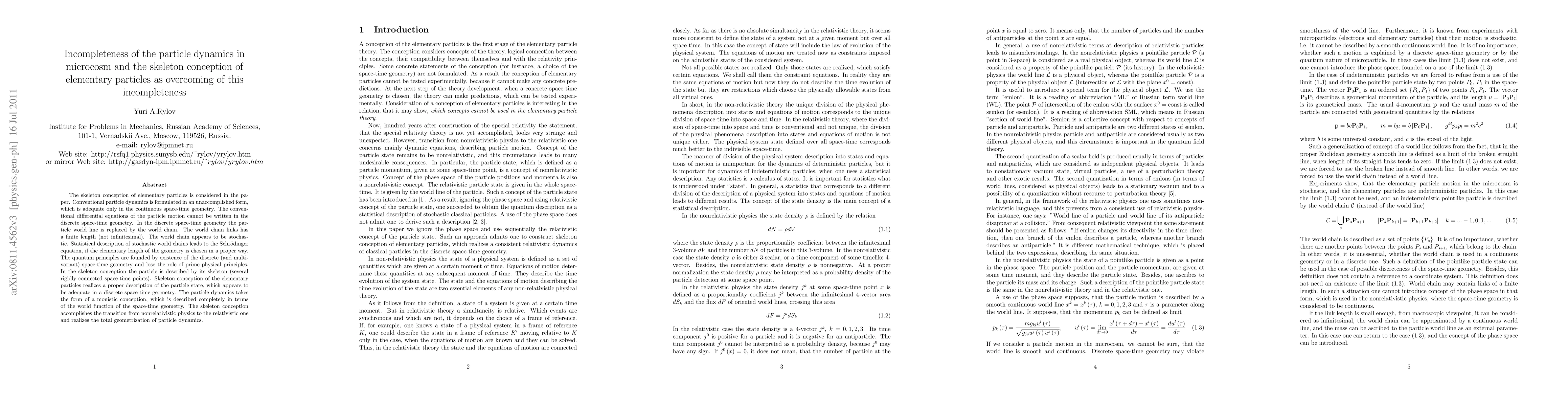 The skeleton conception of elementary particles is considered in the paper. Conventional particle dynamics is formulated in an unaccomplished form, which is adequate only in the continuous space-time geometry. The conventional differential equations of the particle motion cannot be written in the discrete space-time geometry. In the discrete space-time geometry the particle world line is replaced by the world chain. The world chain links has a finite length (not infinitesimal). The world chain appears to be stochastic. Statistical description of stochastic world chains leads to the Schr\"{o}dinger equation, if the elementary length of the geometry is chosen in a proper way. The quantum principles are founded by existence of the discrete (and multivariant) space-time geometry and lose the role of prime physical principles. In the skeleton conception the particle is described by its skeleton (several rigidly connected space-time points). Skeleton conception of the elementary particles realizes a proper description of the particle state, which appears to be adequate in a discrete space-time geometry. The particle dynamics takes the form of a monistic conception, which is described completely in terms of the world function of the space-time geometry. The skeleton conception accomplishes the transition from nonrelativistic physics to the relativistic one and realizes the total geometrization of particle dynamics.