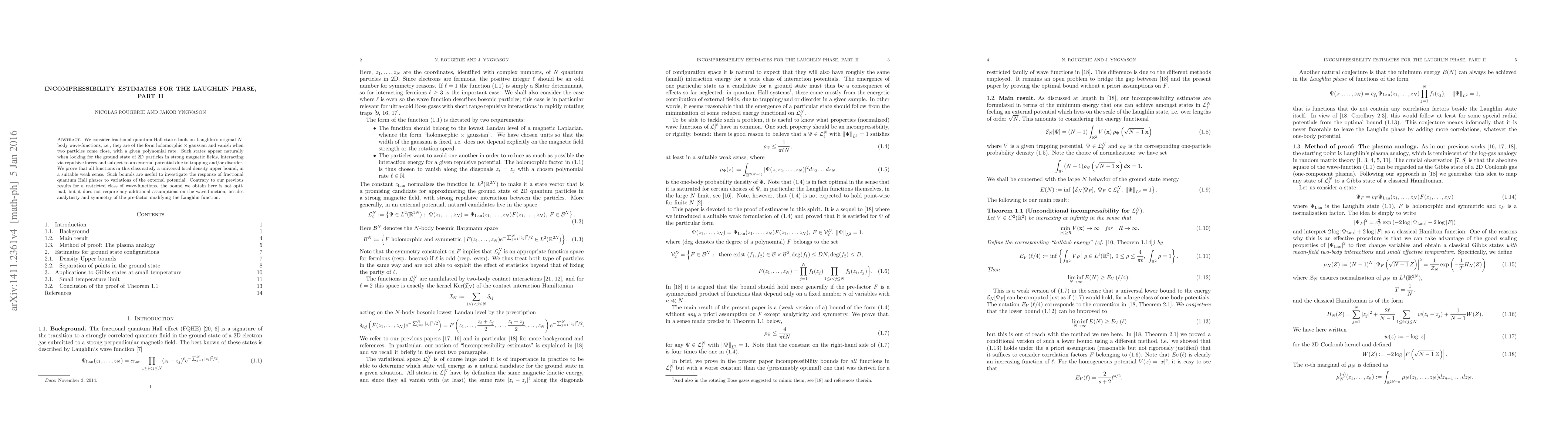 We consider fractional quantum Hall states built on Laughlin's original N-body wave-functions, i.e., they are of the form holomorphic times gaussian and vanish when two particles come close, with a given polynomial rate. Such states appear naturally when looking for the ground state of 2D particles in strong magnetic fields, interacting via repulsive forces and subject to an external potential due to trapping and/or disorder. We prove that all functions in this class satisfy a universal local density upper bound, in a suitable weak sense. Such bounds are useful to investigate the response of fractional quantum Hall phases to variations of the external potential. Contrary to our previous results for a restricted class of wave-functions, the bound we obtain here is not optimal, but it does not require any additional assumptions on the wave-function, besides analyticity and symmetry of the pre-factor modifying the Laughlin function.
