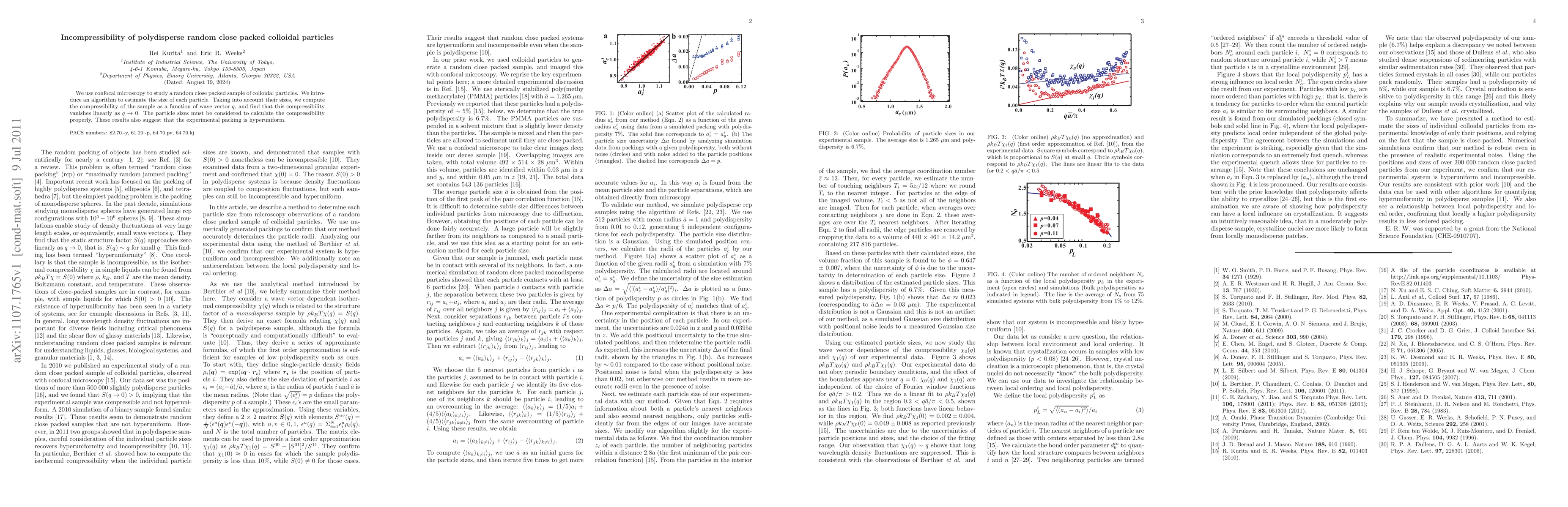 This study employs confocal microscopy to analyze a random close packed colloidal sample, revealing that compressibility vanishes linearly as the wave vector approaches zero, indicating incompressibility. The findings underscore the importance of particle size in calculating compressibility and suggest the packing is hyperuniform.