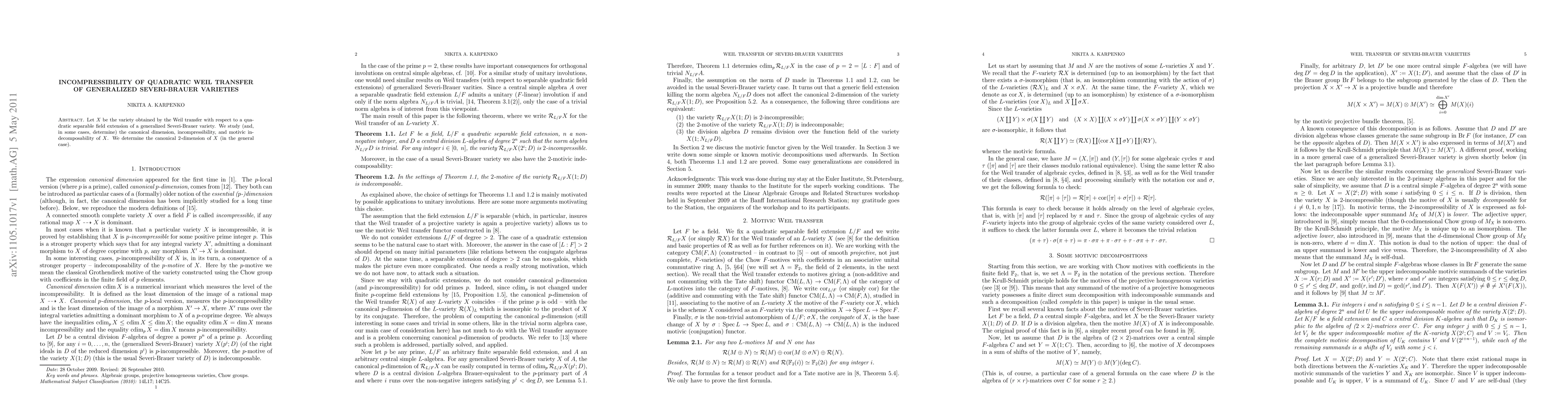 Summary: This paper investigates the properties of the Weil transfer for quadratic separable field extensions of generalized Severi-Brauer varieties, determining their canonical dimension, incompressibility, and motivic indecomposability, with a focus on the canonical 2-dimension in general cases.