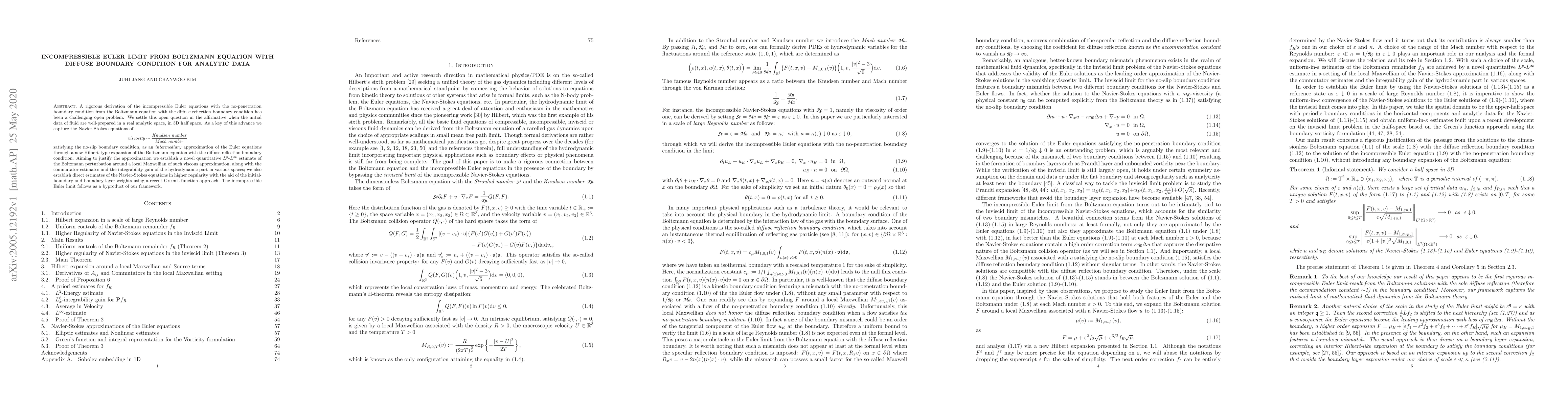 A rigorous derivation of the incompressible Euler equations with the no-penetration boundary condition from the Boltzmann equation with the diffuse reflection boundary condition has been a challenging open problem. We settle this open question in the affirmative when the initial data of fluid are well-prepared in a real analytic space, in 3D half space. As a key of this advance we capture the Navier-Stokes equations of $$\textit{viscosity} \sim \frac{\textit{Knudsen number}}{\textit{Mach number}}$$ satisfying the no-slip boundary condition, as an $\textit{intermediary}$ approximation of the Euler equations through a new Hilbert-type expansion of Boltzmann equation with the diffuse reflection boundary condition. Aiming to justify the approximation we establish a novel quantitative $L^p$-$L^\infty$ estimate of the Boltzmann perturbation around a local Maxwellian of such viscous approximation, along with the commutator estimates and the integrability gain of the hydrodynamic part in various spaces; we also establish direct estimates of the Navier-Stokes equations in higher regularity with the aid of the initial-boundary and boundary layer weights using a recent Green's function approach. The incompressible Euler limit follows as a byproduct of our framework.