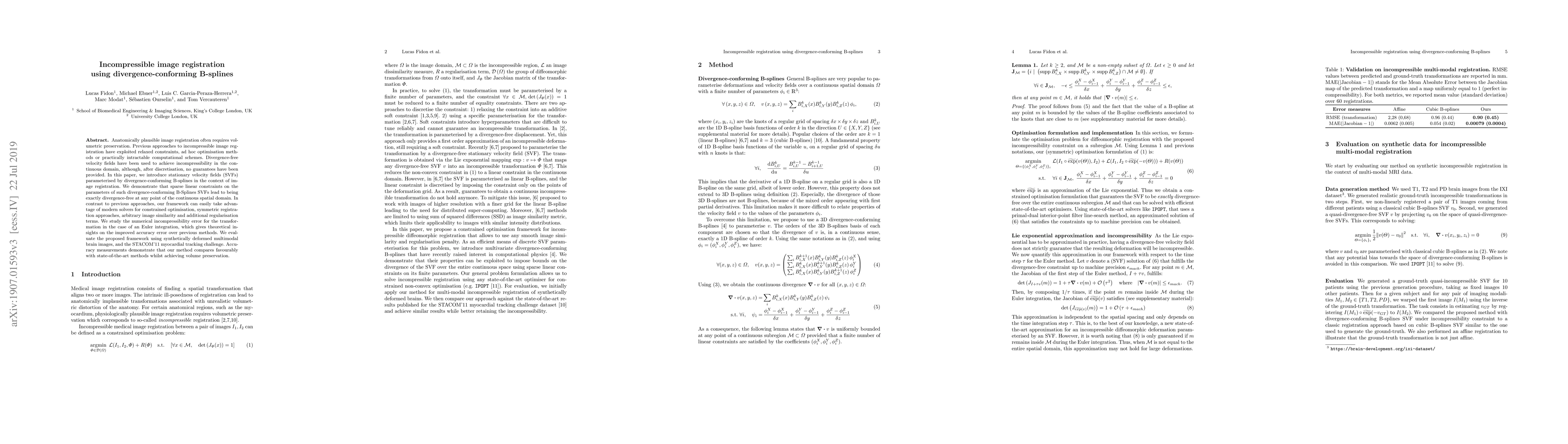 This paper introduces a novel method for incompressible image registration using divergence-conforming B-splines to parameterize stationary velocity fields, ensuring exact divergence-free properties. The proposed framework achieves volume preservation and outperforms previous methods in accuracy and computational efficiency.