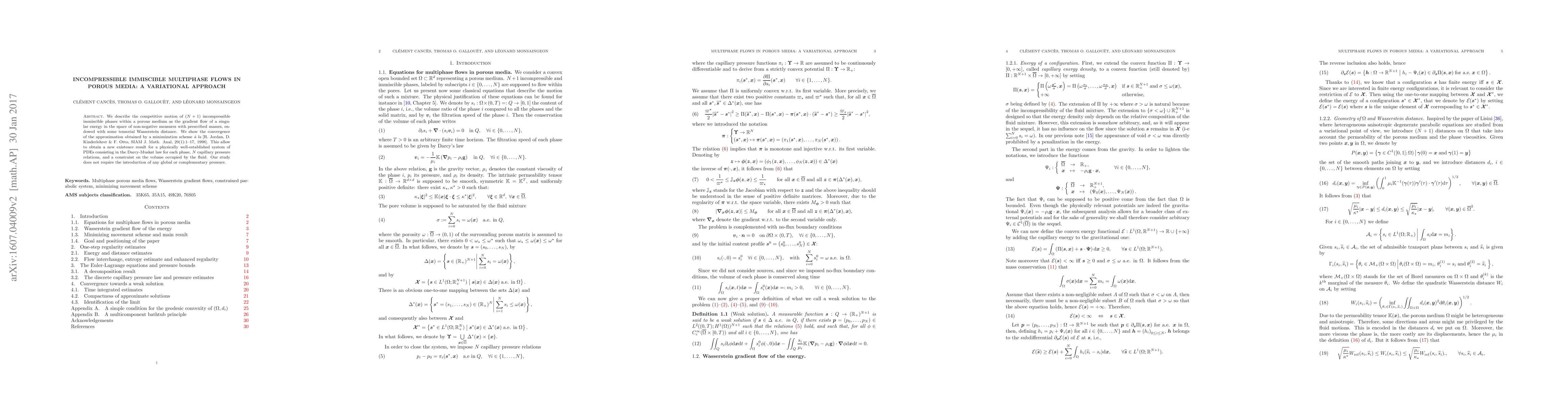 We describe the competitive motion of (N + 1) incompressible immiscible phases within a porous medium as the gradient flow of a singular energy in the space of non-negative measures with prescribed mass endowed with some tensorial Wasserstein distance. We show the convergence of the approximation obtained by a minimization schem\`e a la [R. Jordan, D. Kinder-lehrer \& F. Otto, SIAM J. Math. Anal, 29(1):1--17, 1998]. This allow to obtain a new existence result for a physically well-established system of PDEs consisting in the Darcy-Muskat law for each phase, N capillary pressure relations, and a constraint on the volume occupied by the fluid. Our study does not require the introduction of any global or complementary pressure.