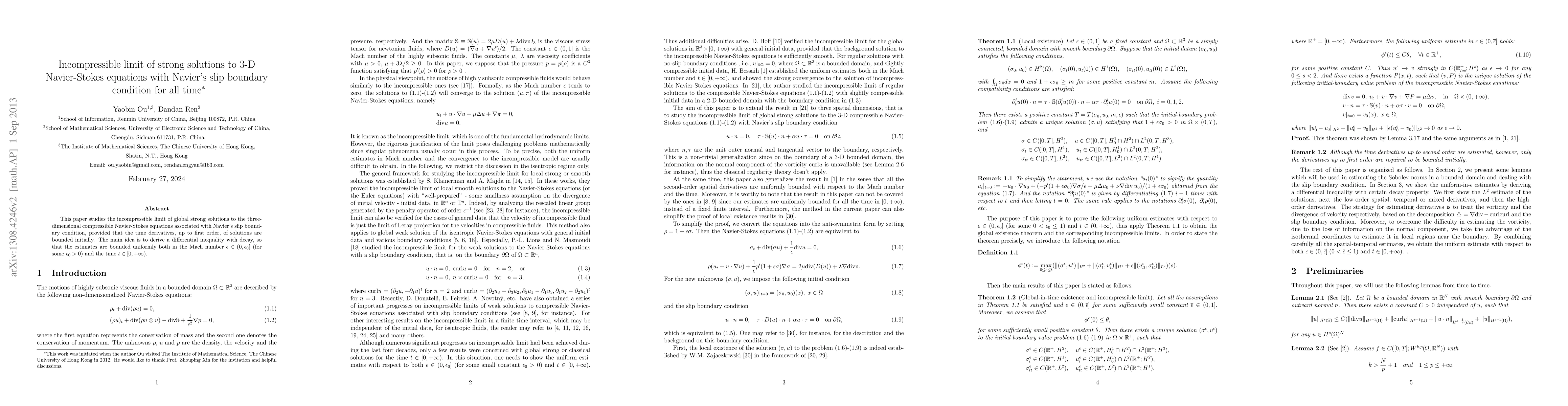 This paper studies the incompressible limit of global strong solutions to the three-dimensional compressible Navier-Stokes equations associated with Navier's slip boundary condition, provided that the time derivatives, up to first order, of solutions are bounded initially. The main idea is to derive a differential inequality with decay, so that the estimates are bounded uniformly both in the Mach number 0<\epsilon<=\epsilon 0 for some \epsilon 0>0 and the time t>=0.