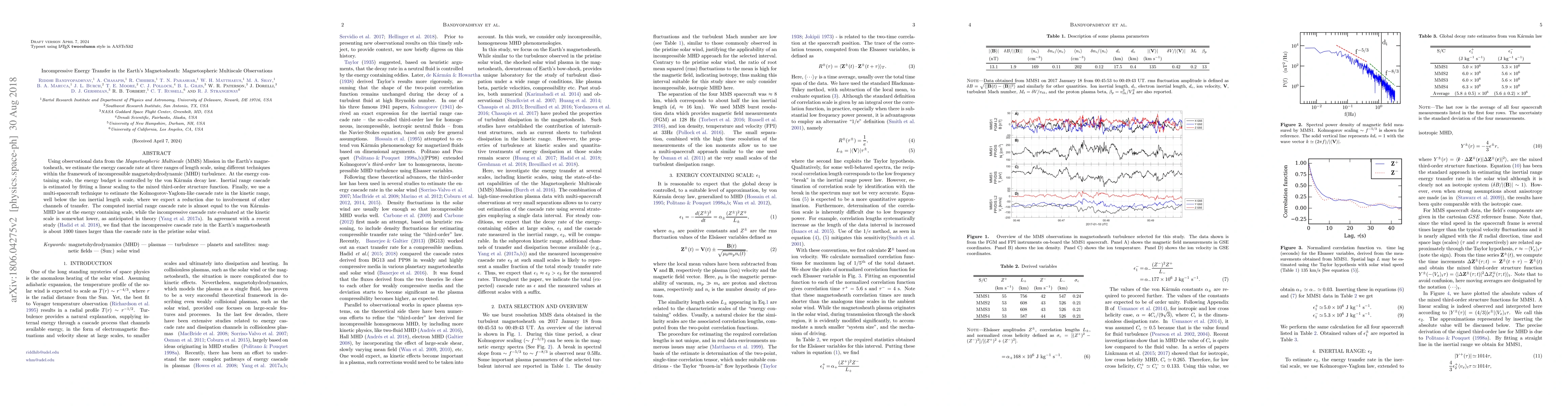This paper uses MMS Mission data to analyze energy cascade rates in the Earth's magnetosheath under incompressible MHD turbulence, finding that the inertial range cascade aligns with the von Kármán decay law, while the kinetic scale cascade rate is lower, and the incompressive energy transfer rate is significantly higher than in the solar wind.