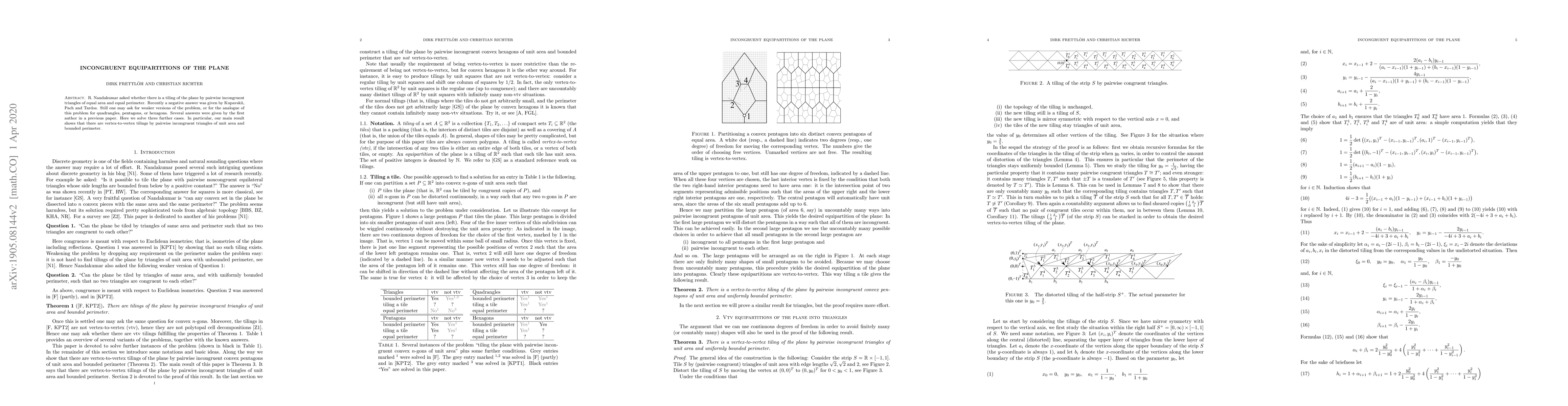 This paper addresses the problem of tiling the plane with pairwise incongruent triangles of equal area and perimeter, confirming a negative answer to the original question posed by Nandakumar. The authors extend previous results by solving additional cases, notably demonstrating the existence of vertex-to-vertex tilings using pairwise incongruent triangles of unit area and bounded perimeter.