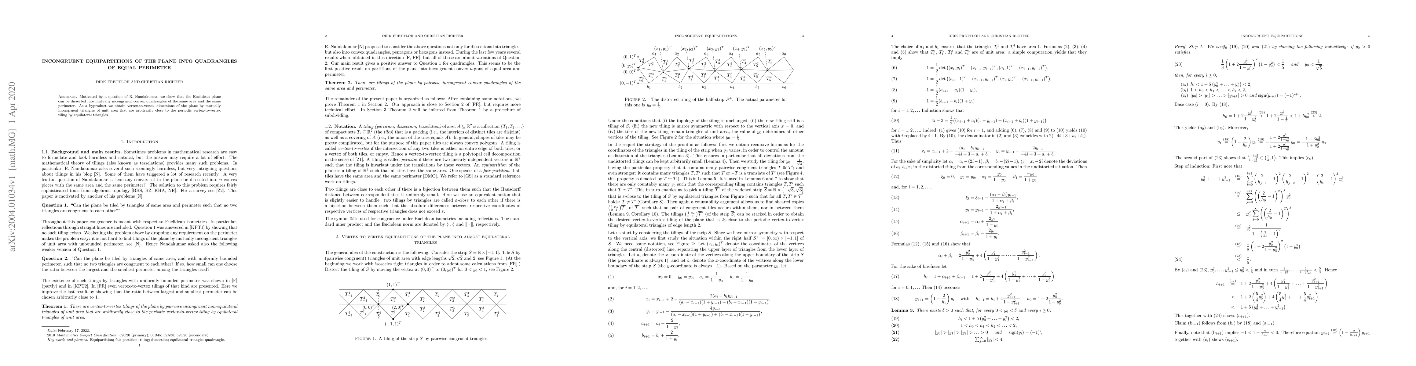 This paper demonstrates that the Euclidean plane can be divided into non-identical convex quadrilaterals with equal area and perimeter. Additionally, it provides a dissection of the plane into triangles of unit area that are nearly periodic, closely resembling equilateral tilings.