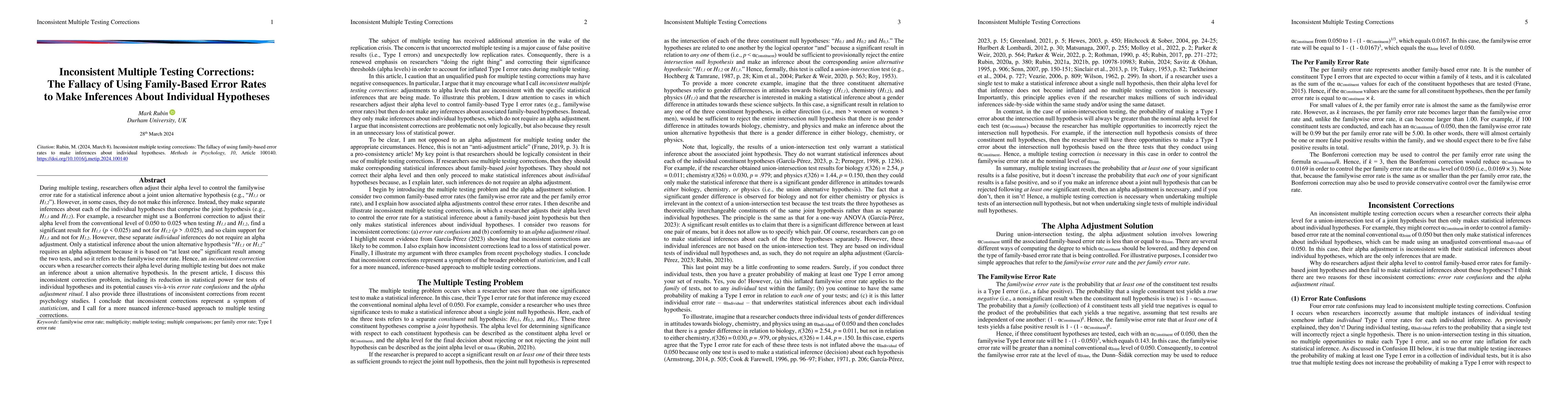 This paper highlights the fallacy of using family-based error rate corrections (like Bonferroni) for individual hypothesis inferences during multiple testing, noting reduced statistical power and calling for a more inference-driven approach to corrections. It provides examples from psychology studies to illustrate this inconsistency.