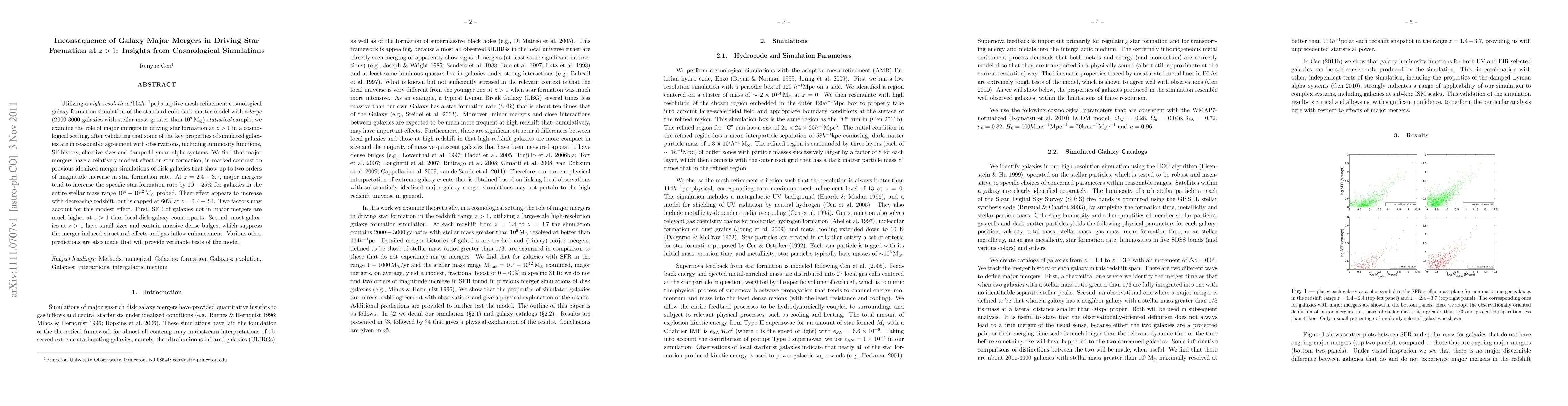 Utilizing a high-resolution (114 pc/h) adaptive mesh-refinement cosmological galaxy formation simulation of the standard cold dark matter model with a large (2000-3000 galaxies with stellar mass greater than 1e9 Msun) statistical sample, we examine the role of major mergers in driving star formation at z>1 in a cosmological setting, after validating that some of the key properties of simulated galaxies are in reasonable agreement with observations, including luminosity functions, SF history, effective sizes and damped Lyman alpha systems. We find that major mergers have a relatively modest effect on star formation, in marked contrast to previous idealized merger simulations of disk galaxies that show up to two orders of magnitude increase in star formation rate. At z=2.4-3.7, major mergers tend to increase the specific star formation rate by 10-25% for galaxies in the entire stellar mass range 10^9-10^12 Msun probed. Their effect appears to increase with decreasing redshift, but is capped at 60% at z=1.4-2.4. Two factors may account for this modest effect. First, SFR of galaxies not in major mergers are much higher at z>1 than local disk galaxy counterparts. Second, most galaxies at z>1 have small sizes and contain massive dense bulges, which suppress the merger induced structural effects and gas inflow enhancement. Various other predictions are also made that will provide verifiable tests of the model.