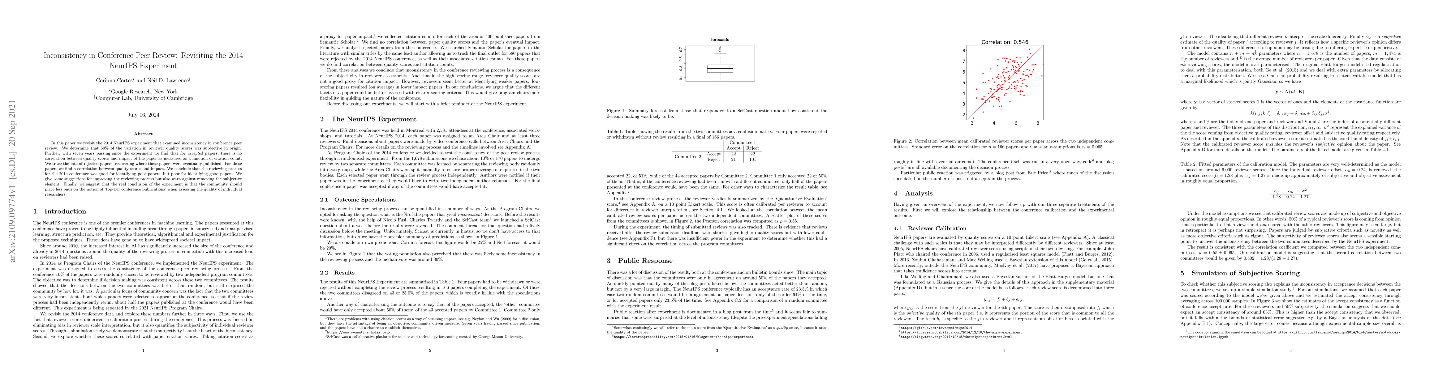 In this paper we revisit the 2014 NeurIPS experiment that examined inconsistency in conference peer review. We determine that 50\% of the variation in reviewer quality scores was subjective in origin. Further, with seven years passing since the experiment we find that for \emph{accepted} papers, there is no correlation between quality scores and impact of the paper as measured as a function of citation count. We trace the fate of rejected papers, recovering where these papers were eventually published. For these papers we find a correlation between quality scores and impact. We conclude that the reviewing process for the 2014 conference was good for identifying poor papers, but poor for identifying good papers. We give some suggestions for improving the reviewing process but also warn against removing the subjective element. Finally, we suggest that the real conclusion of the experiment is that the community should place less onus on the notion of `top-tier conference publications' when assessing the quality of individual researchers. For NeurIPS 2021, the PCs are repeating the experiment, as well as conducting new ones.