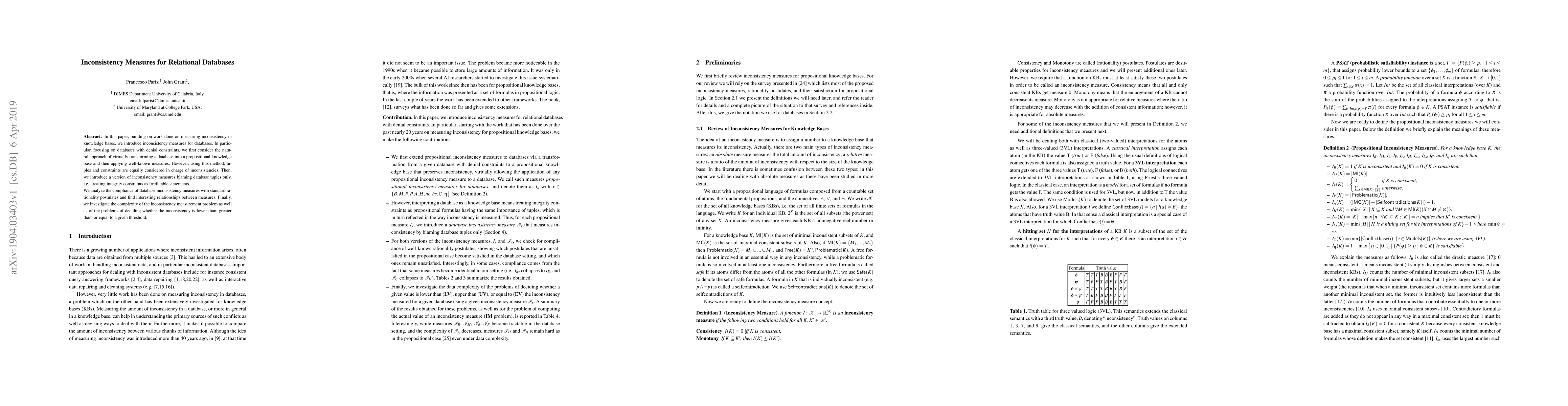 This paper introduces inconsistency measures for relational databases, particularly focusing on those with denial constraints. It proposes a method that isolates tuples as the source of inconsistencies while treating constraints as irrefutable, and analyzes the complexity of inconsistency measurement and related decision problems.