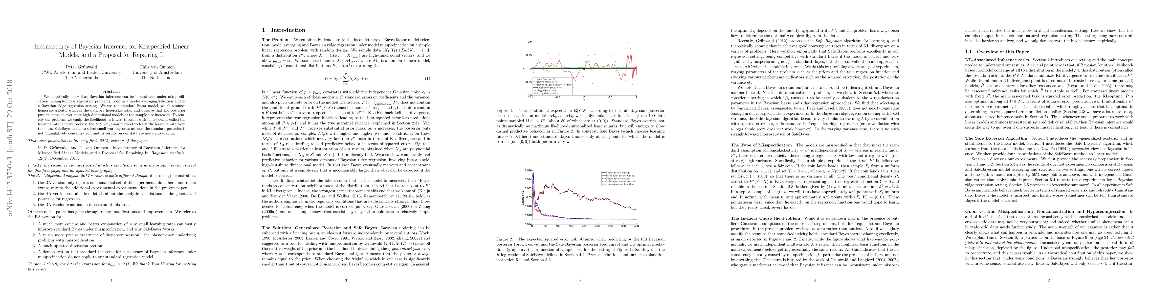 We empirically show that Bayesian inference can be inconsistent under misspecification in simple linear regression problems, both in a model averaging/selection and in a Bayesian ridge regression setting. We use the standard linear model, which assumes homoskedasticity, whereas the data are heteroskedastic, and observe that the posterior puts its mass on ever more high-dimensional models as the sample size increases. To remedy the problem, we equip the likelihood in Bayes' theorem with an exponent called the learning rate, and we propose the Safe Bayesian method to learn the learning rate from the data. SafeBayes tends to select small learning rates as soon the standard posterior is not `cumulatively concentrated', and its results on our data are quite encouraging.